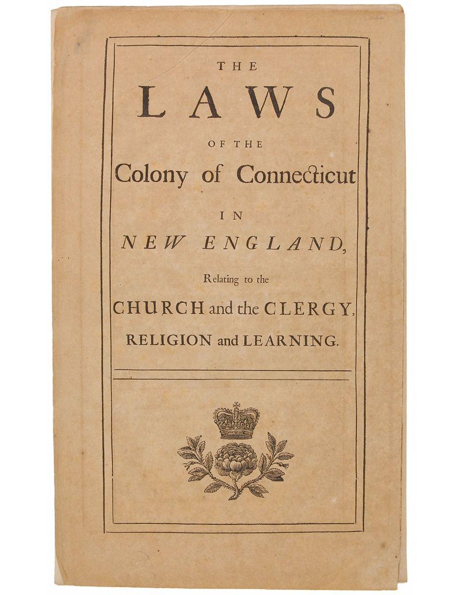 Partly–printed document entitled, “The Laws of the Colony of Connecticut in New England, Relating to the Church and the Clergy, Religion and Learning,” 18 pages, 8.75 x 14.25, with 285-286 not present and evidently not part of the printing. Taken from a larger volume entitled The Laws of the British Plantations in America, Relating to the Church and the Clergy, Religion and Learning, published in 1721, the chapter offered is from that volume. Final page, part of a larger act, reads, in part: “That if any Indian or Indians shall labour or play on the Sabbath Day, within the Limits of any English Town, every such Indian, being duly convicted, shall pay a Fine of Five Shillings, whereof one Half shall be to the Complainer, the rest to the County Treasury, or else set in the Stocks one Hour…And be it further Enacted…That no Indian or Indians shall at any time Powaw or perform outward Worship to false Gods, or to the Devil, within this Colony, on pain of forfeiting the Sum of Five Pounds to the Publick Treasury of this Colony for every time any Indian or Indians shall be convicted of performing or doing the same. And if any Person or Persons of the Age of Twenty Years or upwards, shall at any Time be present at any Indian Play or Powawing at any of their General Meetings, every such Person shall forfeit the Sum of Forty Shillings; and if any Person shall join in playing with any Indian or Indians, or shall lay any Wager with or for any Indian about or concerning any such Play or Game, he shall forfeit and pay a Fine of Ten Pounds.” In very good condition, with uniform toning (heavier to first and last pages), and some light foxing and creasing.