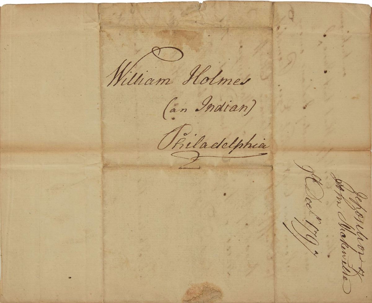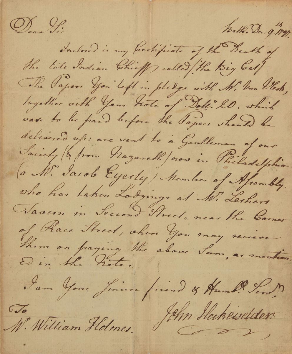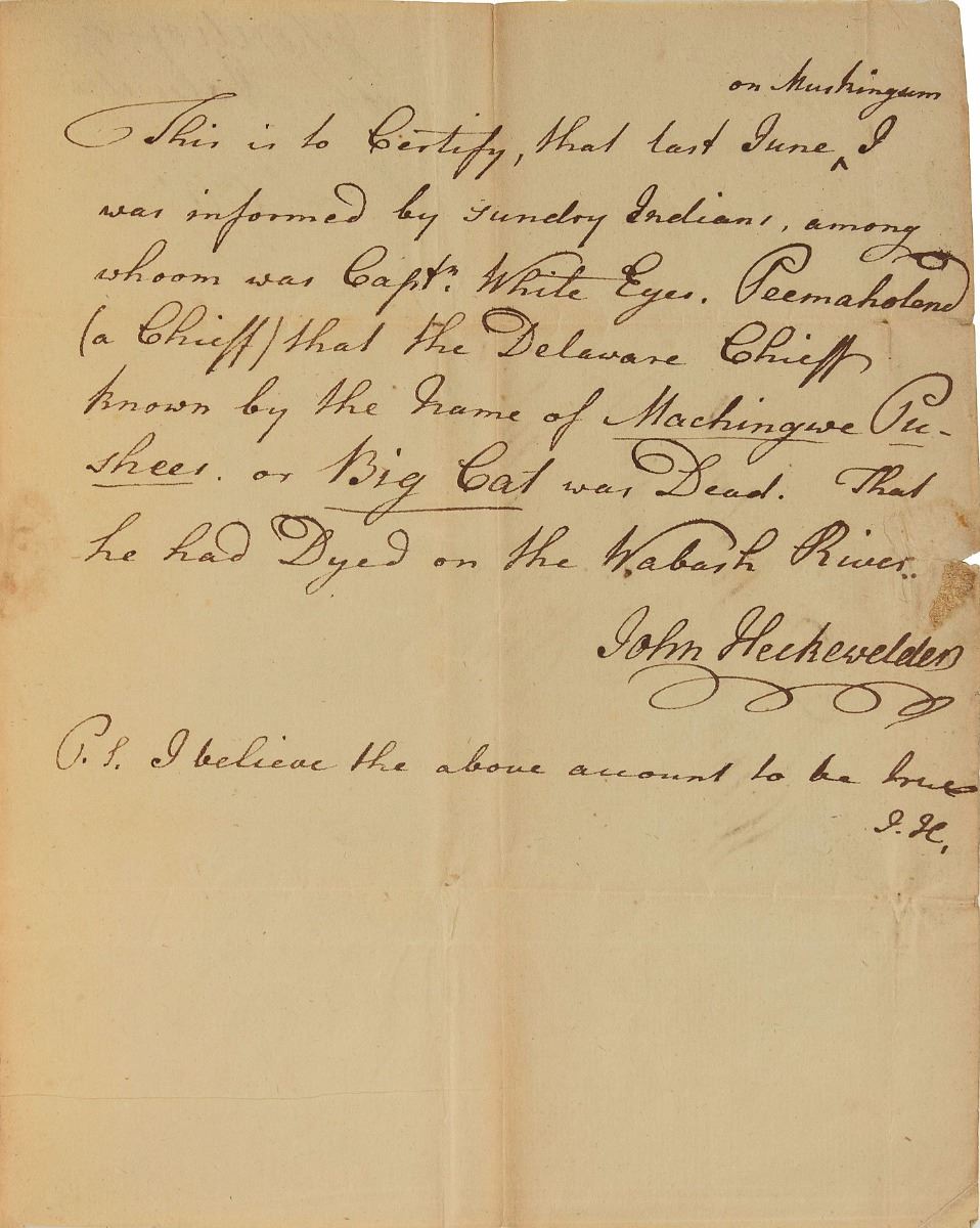 LS signed “John Heckewelder,” two pages, 6.5 x 7.75, December 9, 1797. Letter addressed to "Mr. William Holmes, (an Indian), Philadelphia." In part: "Inclosed is my Certificate of the Death of the late Indian Chieff called (the Big Cat). The Papers you left…together with your Note of Doll's 20 which was to be paid before the Papers should be delivered up, are sent to a Gentleman of out Society…in Philadelphia." The death certificate is penned on the second page, in part: "This is to Certify, that…I was informed by sundry Indians, among whoom was Captain White…that the Delaware Chieff known by the name of Machingwe Pushees, or Big Cat, was Dead. That he had Dyed on the Wabash River." In very good to fine condition. The English-born John Heckewelder was a missionary for the Moravian Church who emigrated to Pennsylvania in 1754. In 1771, he became a full-time evangelist to the Native American Indians, and was sometimes called upon by the government to assist in treaty negotiations with the tribes. He was especially closely associated with the Delawares, studying their languages, manners, and customs. Big Cat, a Lenape chief, had allied with the American patriots during the Revolution and was a signer of the 1785 Treaty of Fort McIntosh.