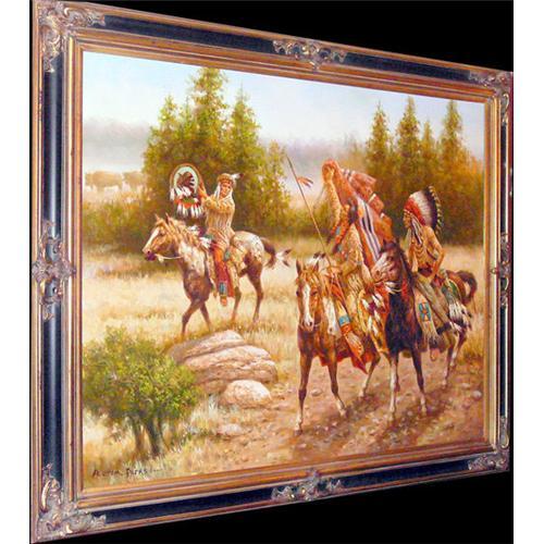 A beautiful and wild scene showing trading goods or exchanging gifts. Wonderful detail. Handsome coloration. A marvelous find. Signed by Aaron Parks.