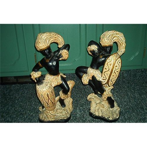 I am featuring at todays auction two Black African Chalk statues. One is holding a war shield and seems to be dancing and the other is playing drums. Each statue weighs approximately 6 pounds. Measurements are 18 1/2 inches tall and the base of each measures 4" x 8" long. Appears to be made of chalk. Maker unknown.