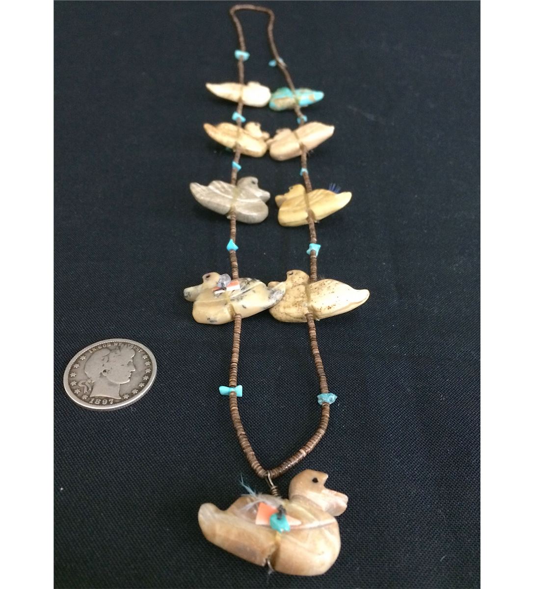 This vintage necklace fits approx. 28" around the neck. Duck motif.