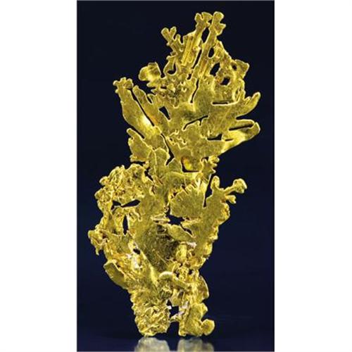 <B>NATIVE GOLD CRYSTALS</B></I><BR> <I>Red Ledge Mine, Washington District, Nevada County, California</B></I><BR>A fine example of one of the rarer forms that native gold can display. <BR>When conditions are right in certain high-grade gold deposits the metal can actually form sharp crystals, usually of octahedral habit. In the case of this specimen, the crystal growth was limited by the narrow fissure it took place in. Since there was no room to grow freely in three dimensions, most of the growth took place laterally giving the branching, dendritic aggregate of octahedrons a flattened appearance. The Red Ledge Mine, now closed, was one of the few producers of this rare, crystalline variety of metallic gold. <BR>Further production from this historic mine is not anticipated. This bright, lustrous specimen measures 1 ½ x 5/8 inch. It weighs 2.98 grams. <BR><BR><b>Shipping:</b> Requires 3rd Party Shipping (<a target="_blank" href="http://www.heritageauctions.com/common/shipping.php">view shipping information</a>)