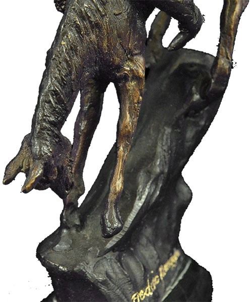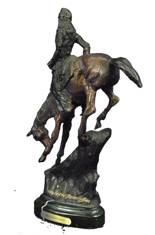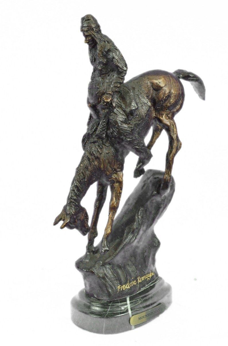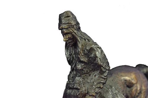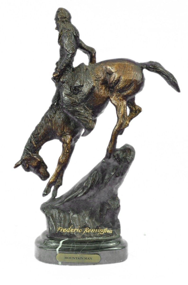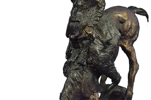 Proud, resilient, strong and a fierce warrior, this Native American watches over his land and tribe. Great attention to detail was paid to his clothing. Most Indian men did not use shirts, but he wears a breech cloth- a long rectangular piece of hide or cloth tucked over his belt, which hangs in the front and back. He also wears moccasins. Mounted on his horse, he turns his head toward the sky and holds up a feather. His gaze is almost pleading. 100% bronze and fully handmade, this carefully detailed sculpture is in a two-toned brown patina and was cast using the Lost Wax Method and mounted on a marble base. Bronze Dimensions with Marble Base: Height 11 X Width 9 inches. Weight: 7 LBS. Inventory: 39-630904593