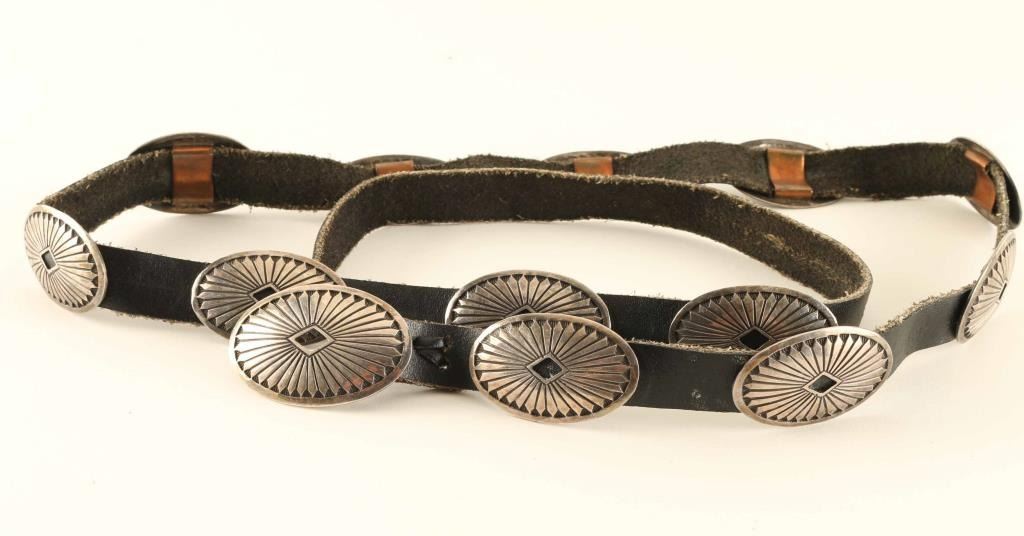 with 13 sterling sunburst conchos, maker marked "B" "sterling". Nicely fitted on black leather belt measures 47" end to end.