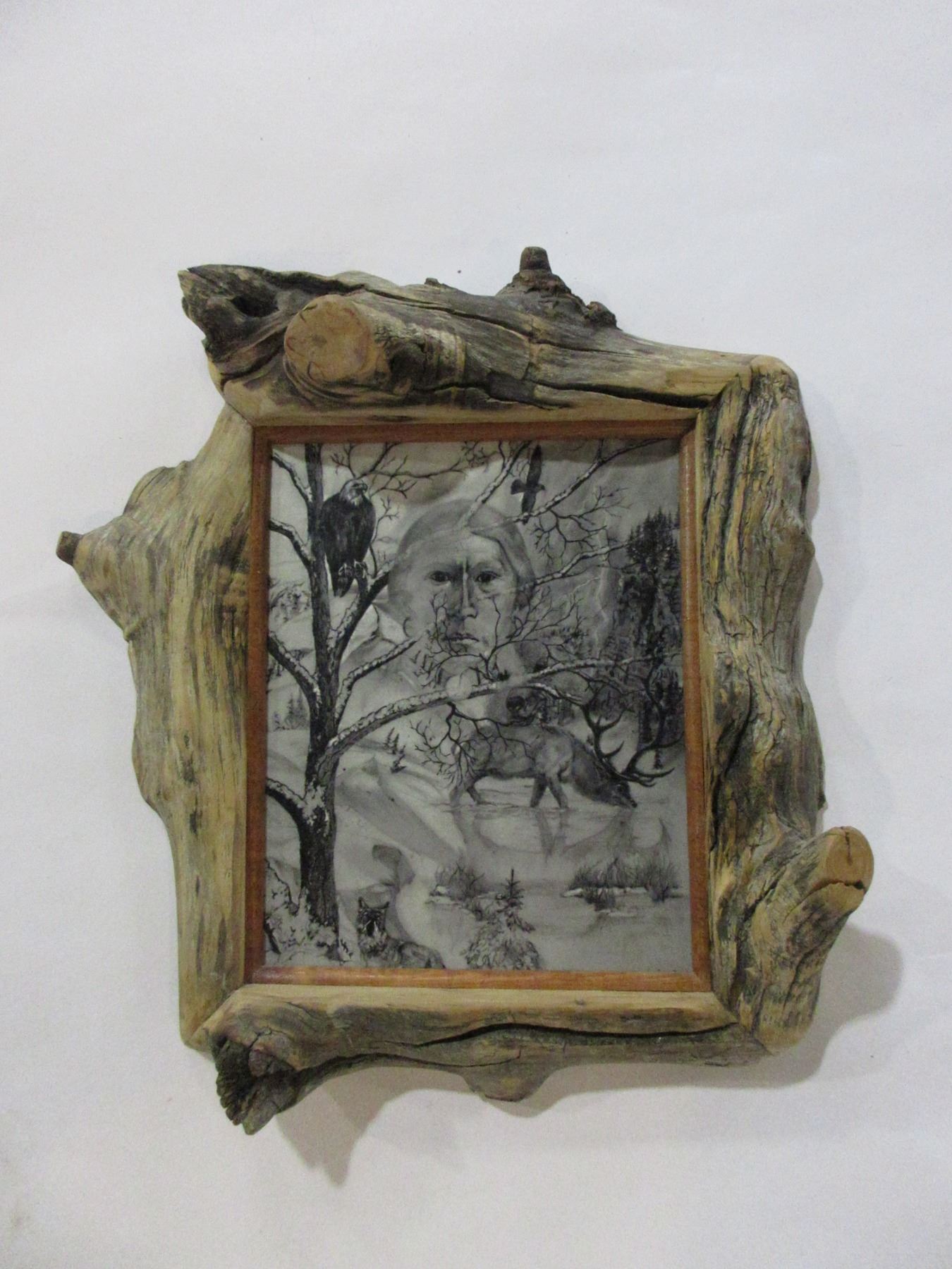 Native Print On Tile- Burl Wood Frame- 15" X 13.5"