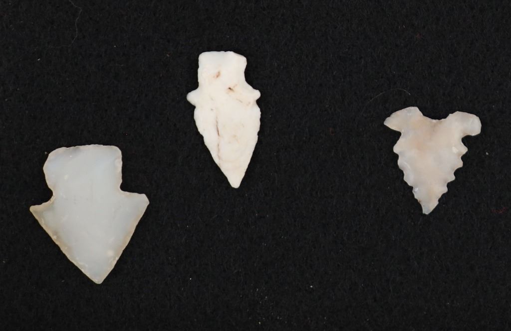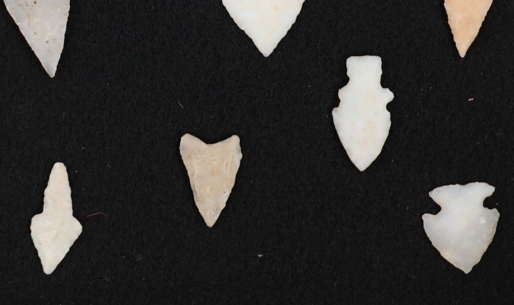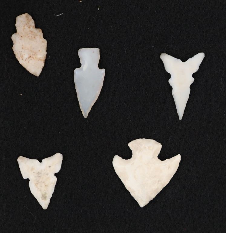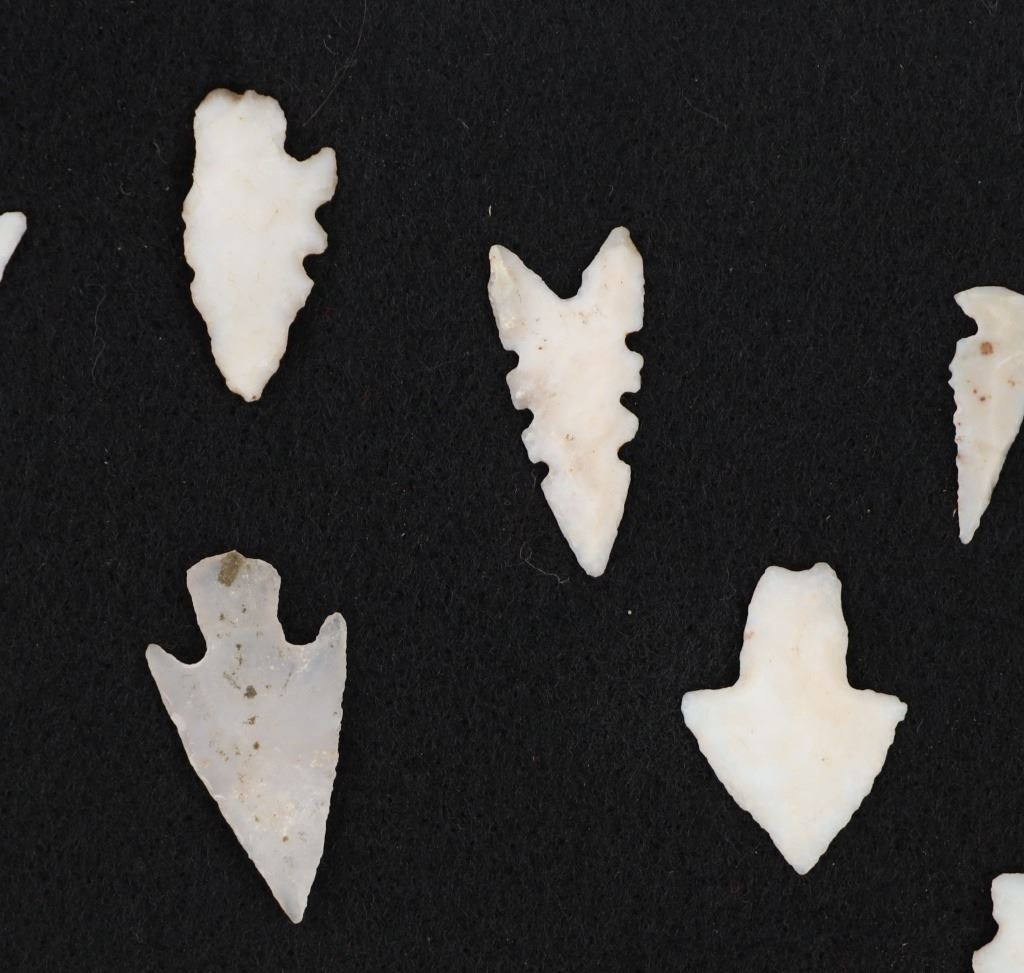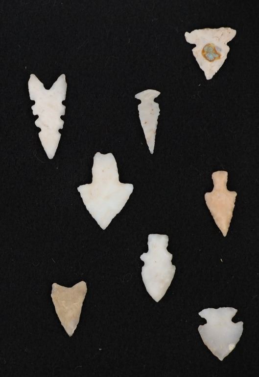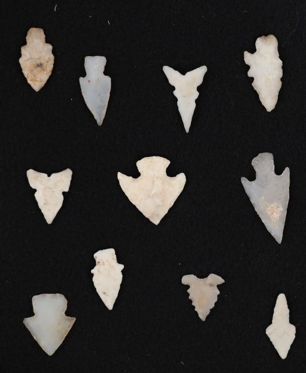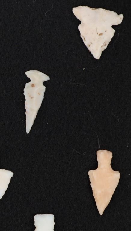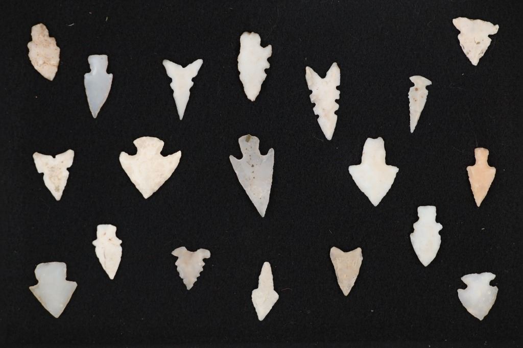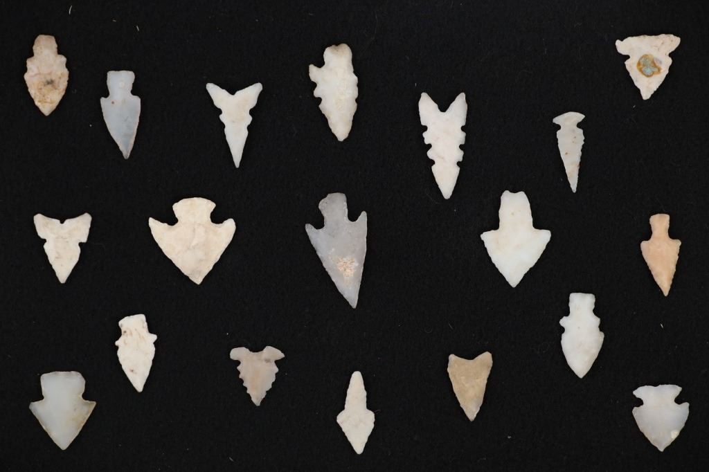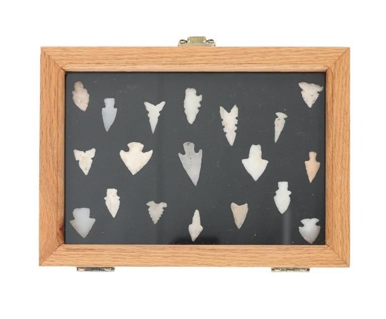 Featured in this lot is this collection of Native and Sub Saharan African projectile points. There are a total of 18 projectile points in this collection constructed from white chert and quartz material with the Sub Saharan African points showing the traditional serrated edges and the Native points showing stems with sharp shoulders and flared shoulders on the rounded points with one of them showing cluster design. The display case is professionally crafted and is set to a black velvet backing. The condition of this collection of points is good and well preserved inside of a display case that shows a overall well preserved condition. The measurements of this display case is 2" x 10" x 7 1/2". The collective weight of this display case is 1lb 14oz.