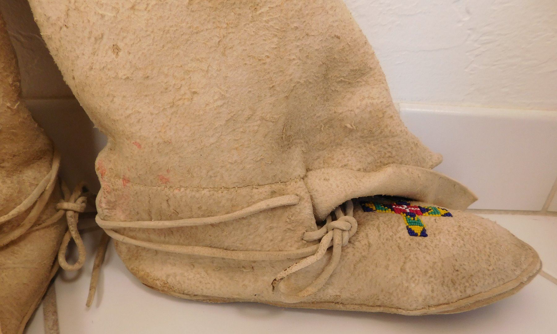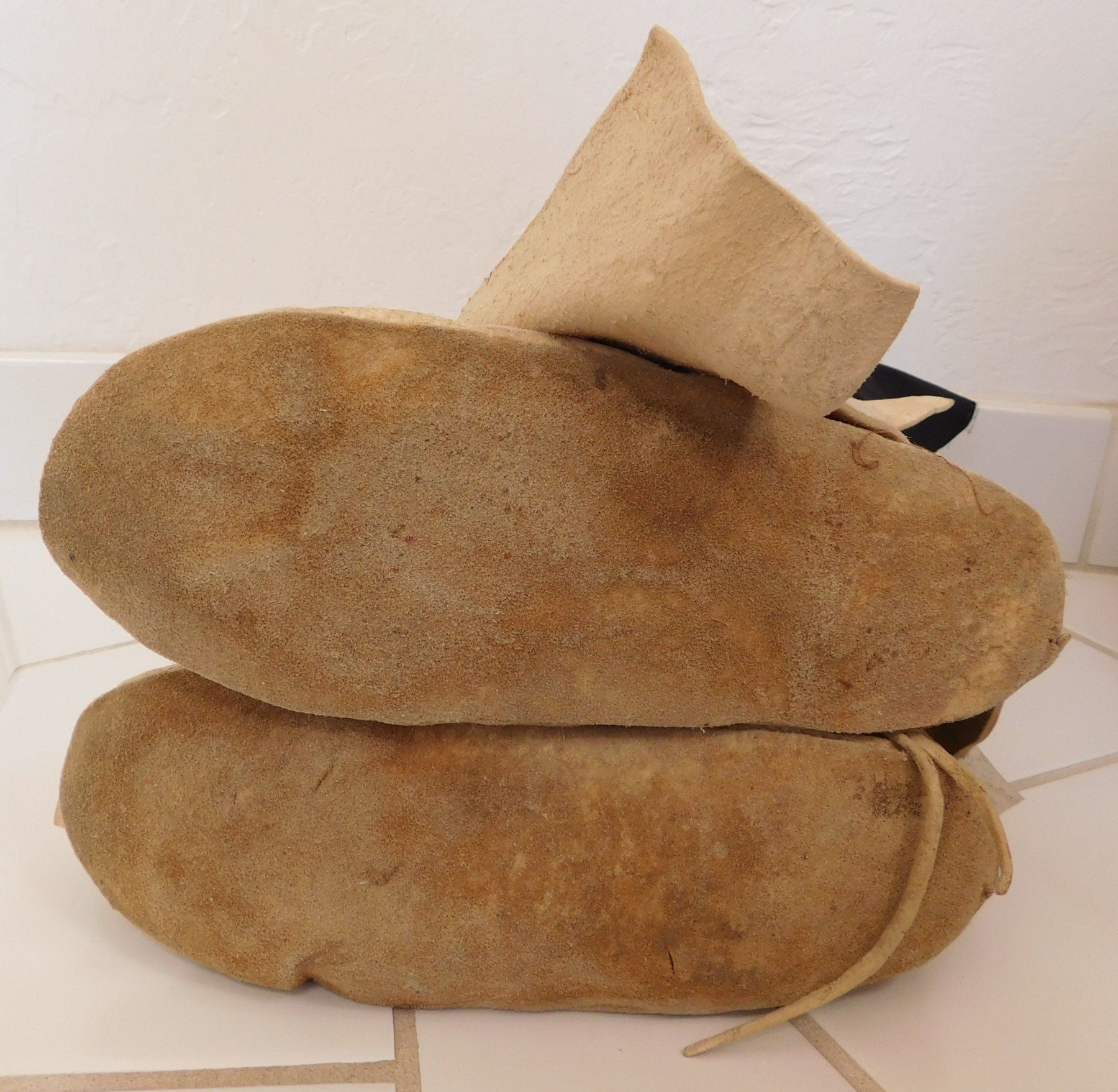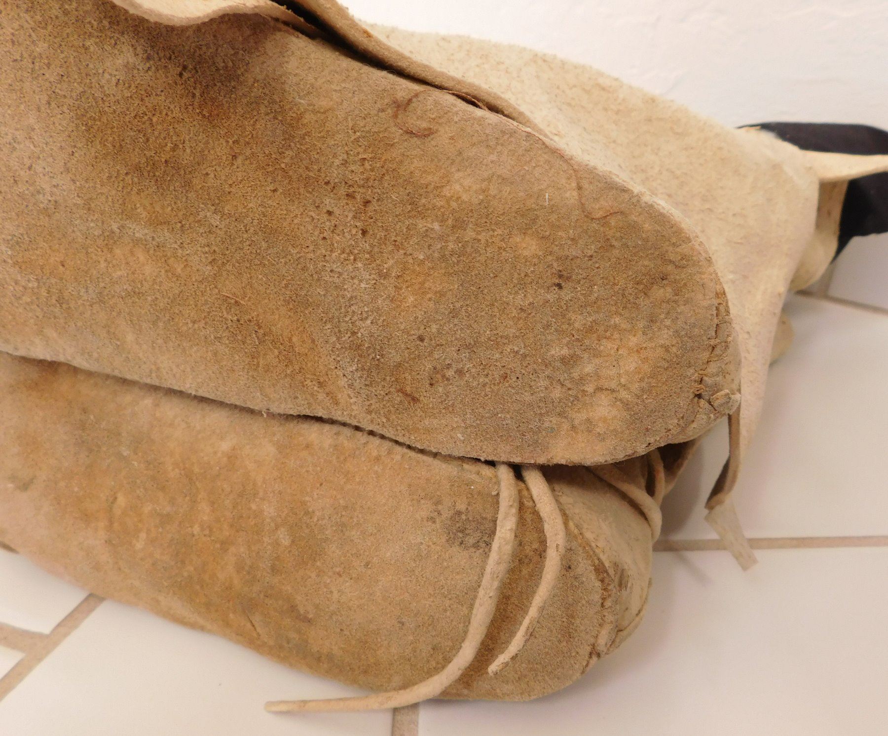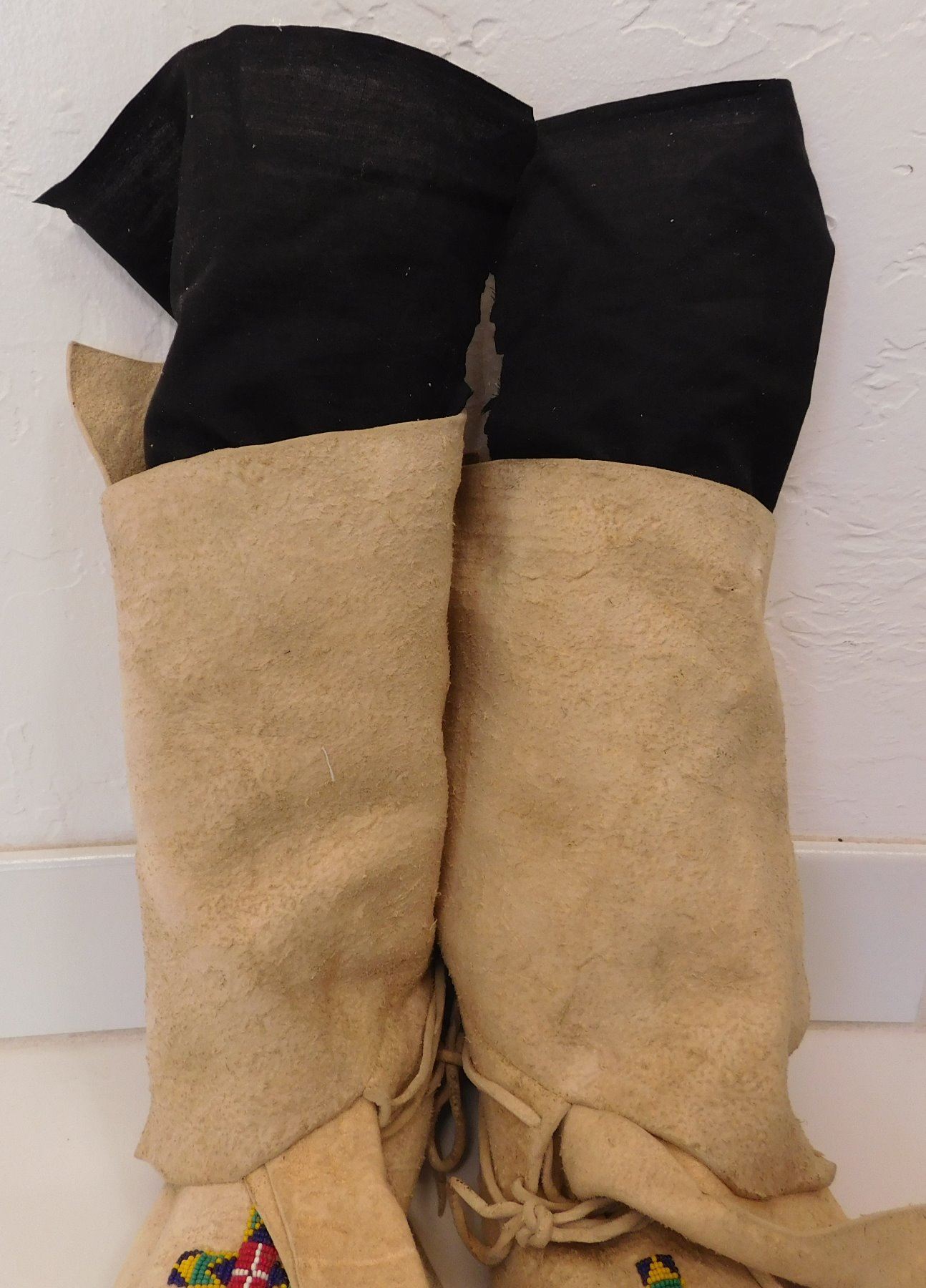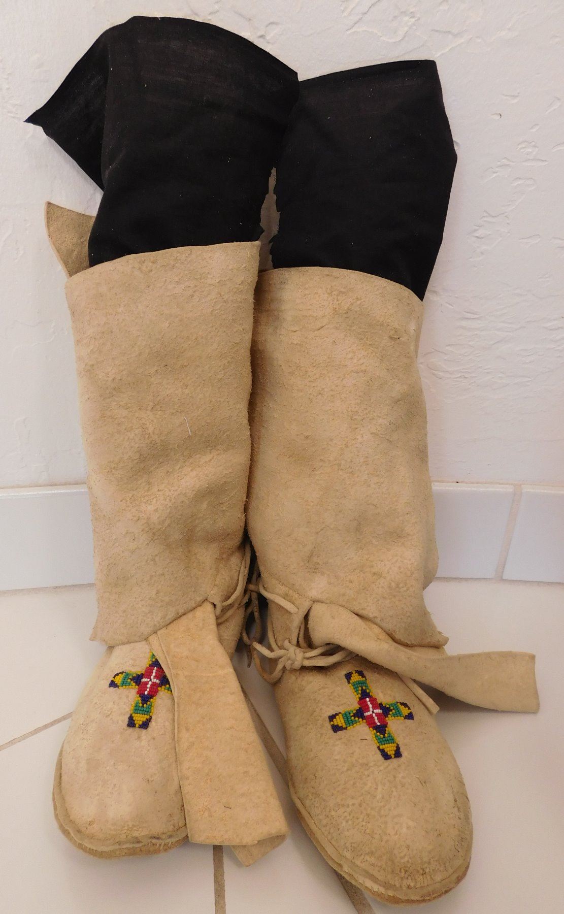 Native Tanned Sioux Hightop Beaded Moccasins, c. 1950s. Made of native tanned leather, the items measure approx. 3" x 10" x 10" tall each. Sioux, Dakotas. Condition: Little to no wear, see images. Shipping: $24.50 w/insurance and signature.
