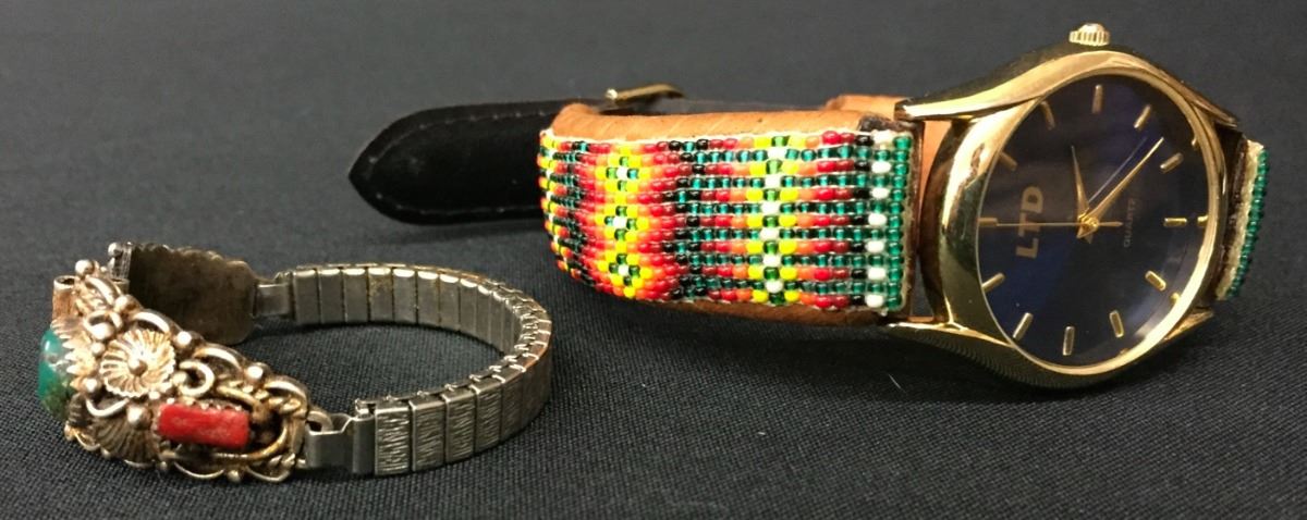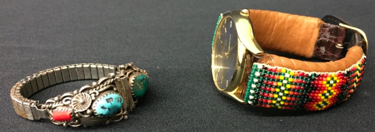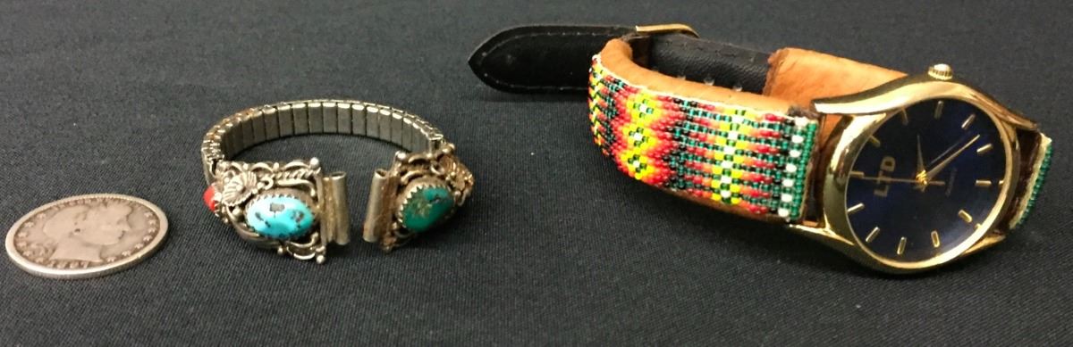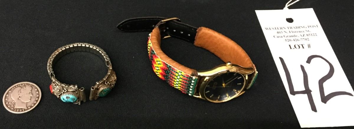 You get a sterling silver Navajo ladies watch tips (with stretch band) and a beaded, leather watch band in this lot. Please look closely at the pics as they are an important part of our description. Shipping: There will be a $5 handling / packaging fee for shipping this lot. The actual cost of postage will be added on top of that.