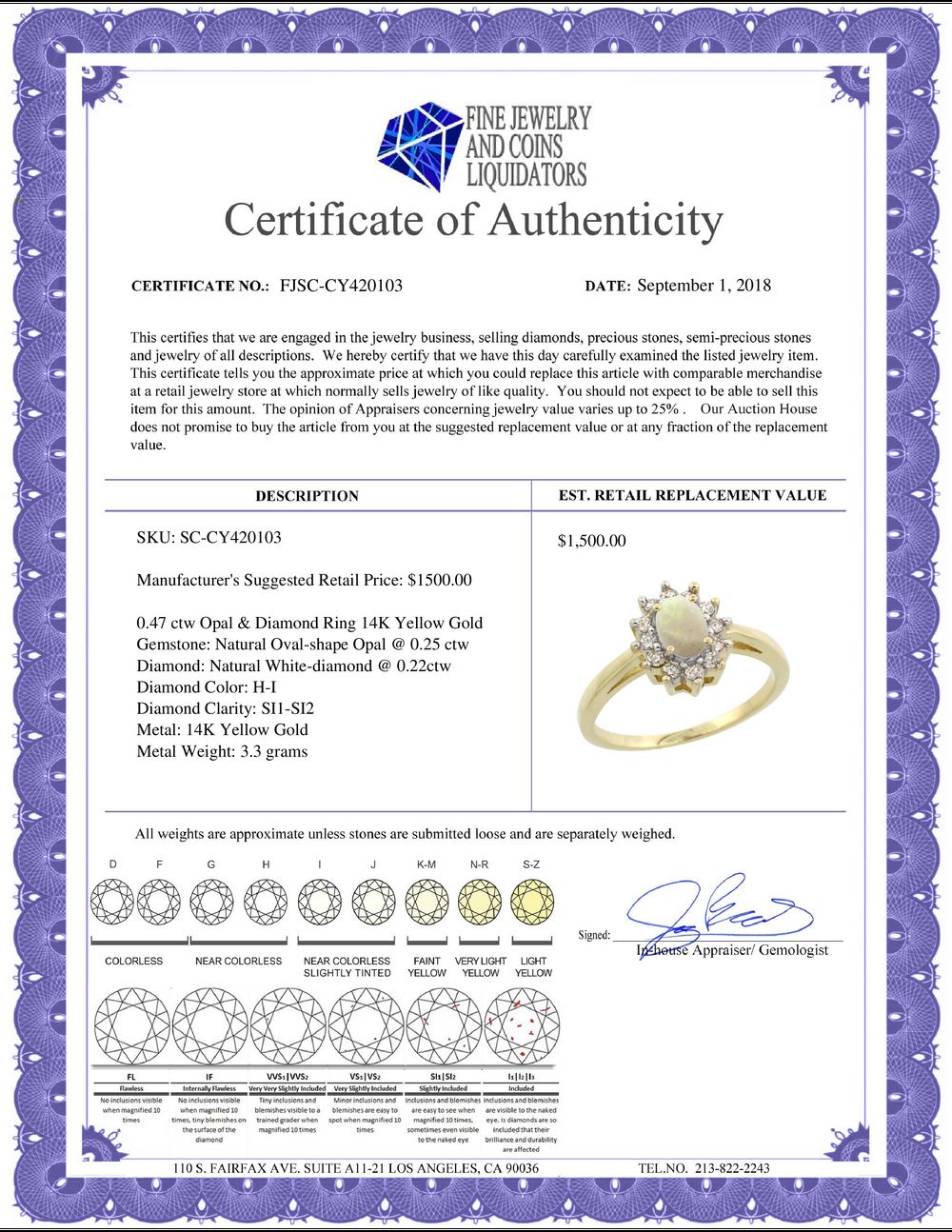 REF-48M2H ---- SKU:SC-CY420103 ---- Manufacturer's Suggested Retail Price - $1500.00 ---- Natural 0.47 ctw Opal & Diamond Engagement Ring 14K Yellow Gold