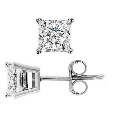Natural 0.92 CTW Princess Cut Diamond Stud Earrings Basket Setting Push Back or Screw back 14KT White Gold