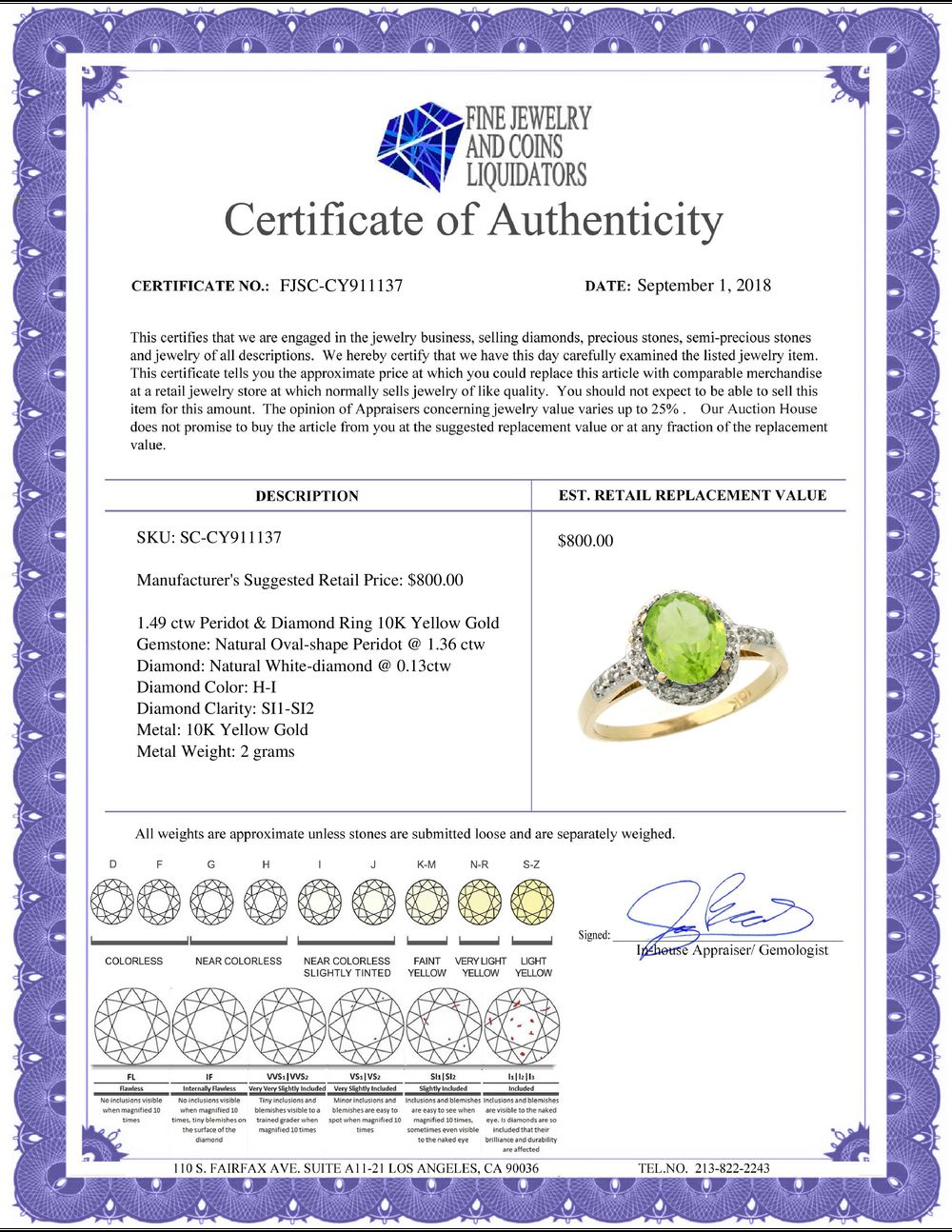 REF-26N3G ---- SKU:SC-CY911137 ---- Manufacturer's Suggested Retail Price - $800.00 ---- Natural 1.49 ctw Peridot & Diamond Engagement Ring 10K Yellow Gold