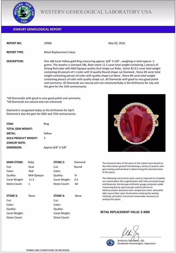 total approx. 5 grams. The Jewelry is stamped 18k, Main stone 11.5 carat total weight containing 1 piece/s of Strong Red color with