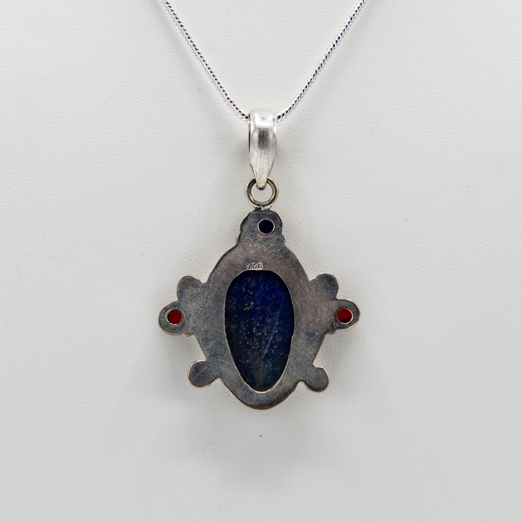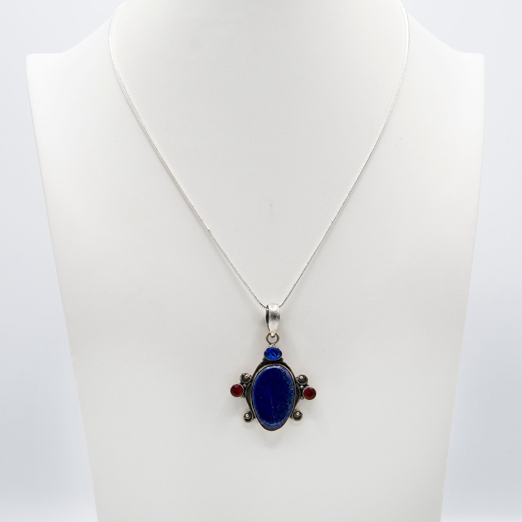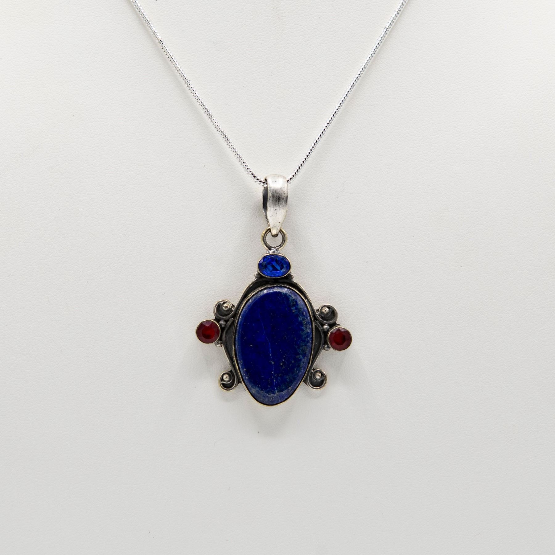 Natural 14.5 Ct Blue Lapis Lazuli Pendant .Complimented with 3 eye clean faceted mix color gemstones. Mounted in elaborately designed solid .925 sterling silver. The total gram wt is approx 20.8. Incudes a 20 "chain.