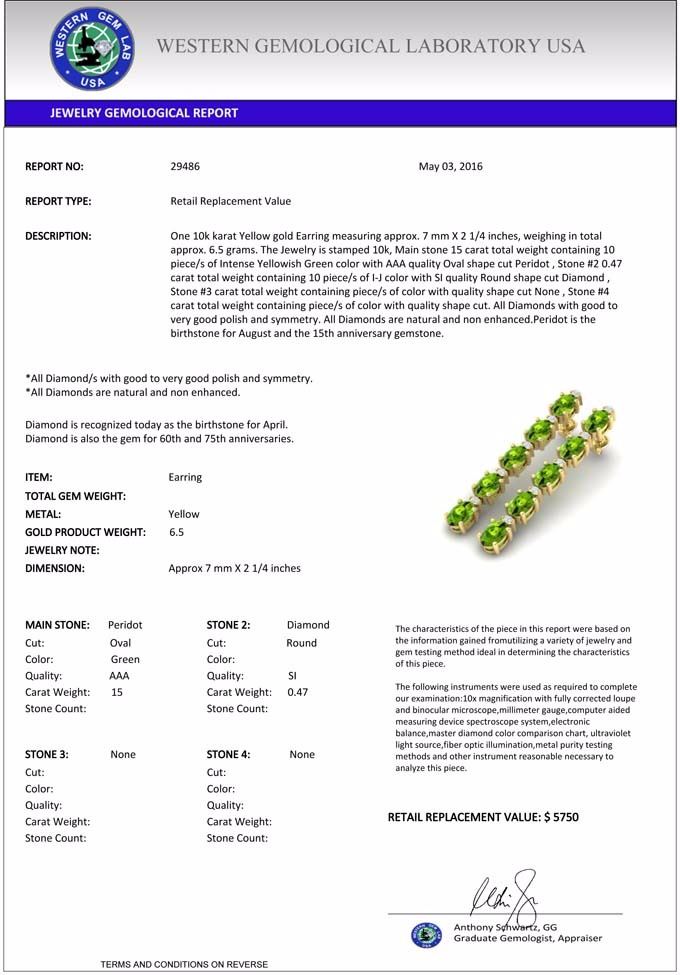 total approx. 6.5 grams. The Jewelry is stamped 10k, Main stone 15 carat total weight containing 10 piece/s of Intense Yellowish Green color with