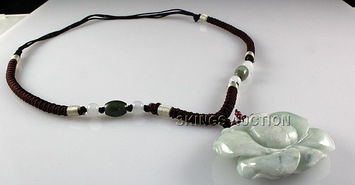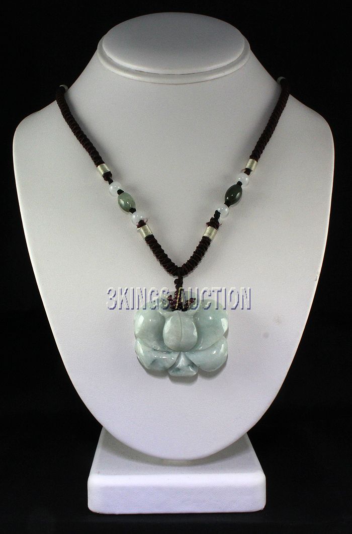 Natural 177.40ctw Lotus Flower Jade Pendant Necklace **|**|** Carved Lotus Flower in Light Green Jade with accents of Garnet and Black Onyx Seed Beads in the Center size: 45.96x41.54x11.59mm ; MSRP: $300