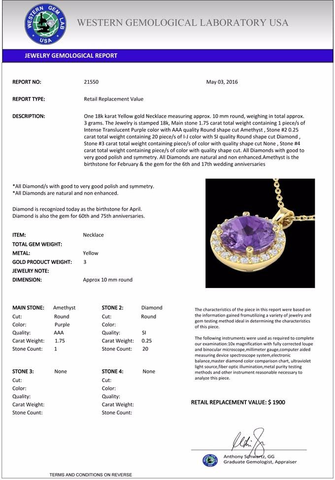 total approx. 3 grams. The Jewelry is stamped 18k, Main stone 1.75 carat total weight containing 1 piece/s of Intense Translucent Purple color with