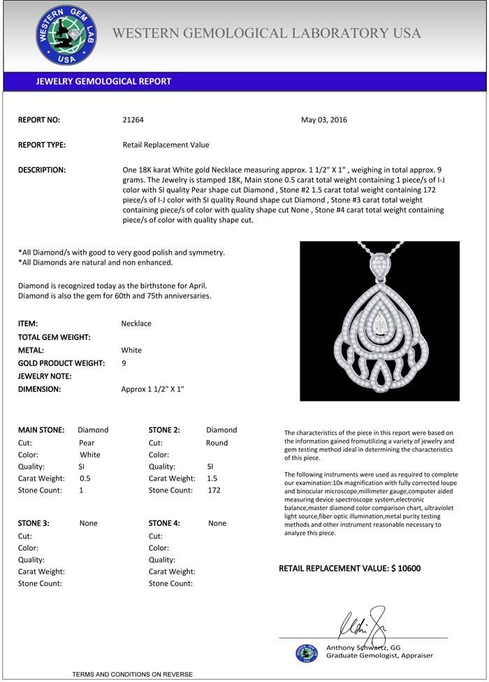 DESCRIPTION OF ARTICLE: One 18K karat White gold Necklace measuring approx. 1 1/2" X 1" , weighing in