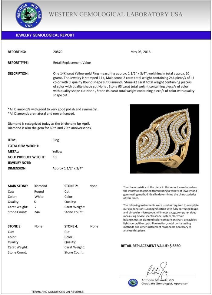 total approx. 10 grams. The Jewelry is stamped 14K, Main stone 2 carat total weight containing 244 piece/s of I-J color with
