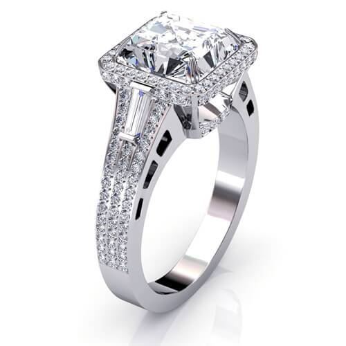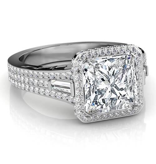 Natural 2.32 CTW Halo Princess Cut and Baguettes Diamond Engagement Ring 18KT White Gold