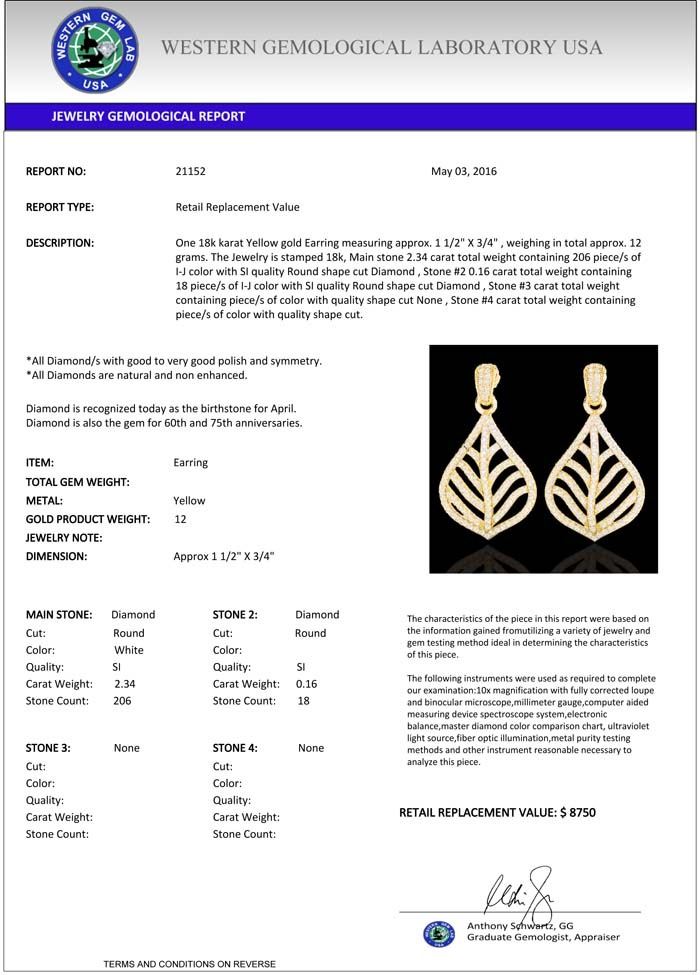 total approx. 12 grams. The Jewelry is stamped 18k, Main stone 2.34 carat total weight containing 206 piece/s of I-J color with