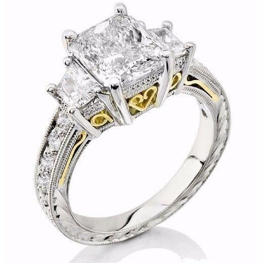 Natural 2.72 CTW Radiant Cut & Trapezoids Diamond Ring 18KT Two- tone