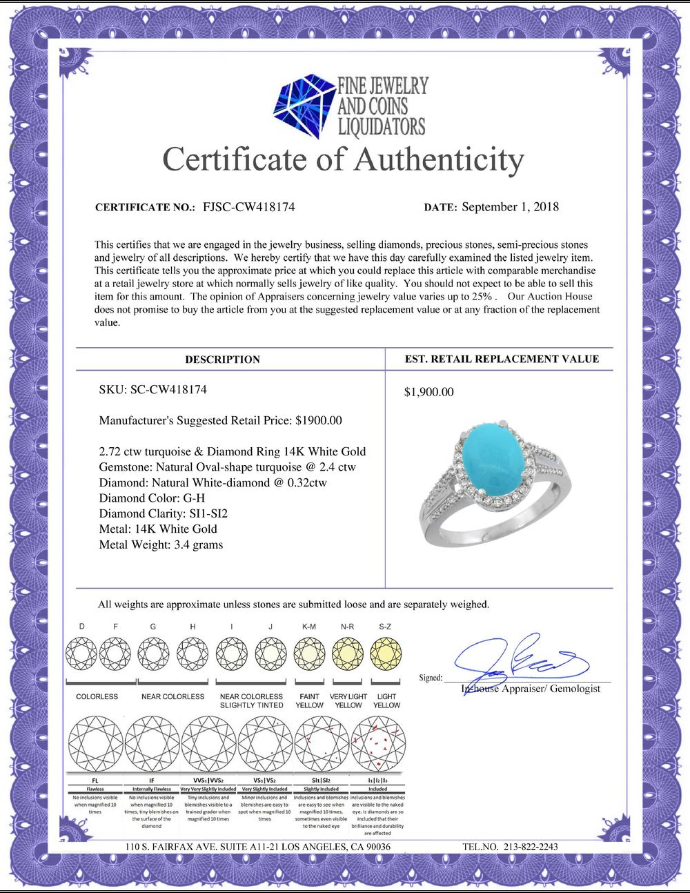 REF-61N3G ---- SKU:SC-CW418174 ---- Manufacturer's Suggested Retail Price - $1900.00 ---- Natural 2.72 ctw turquoise & Diamond Engagement Ring 14K White Gold