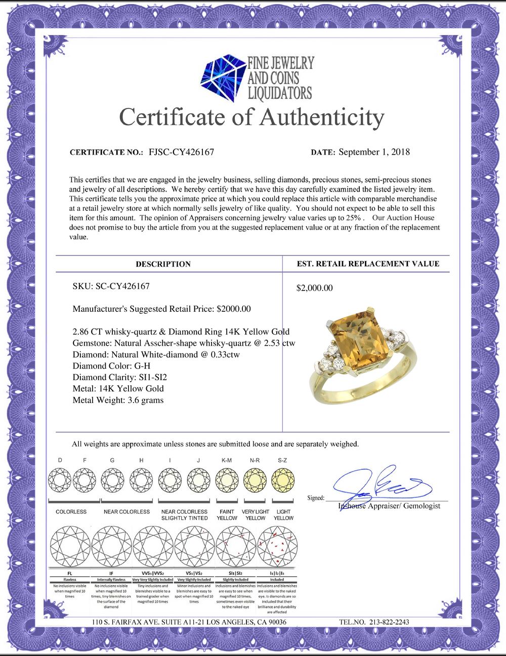 REF-64M7H ---- SKU:SC-CY426167 ---- Manufacturer's Suggested Retail Price - $2000.00 ---- Natural 2.86 ctw whisky-quartz & Diamond Engagement Ring 14K Yellow Gold