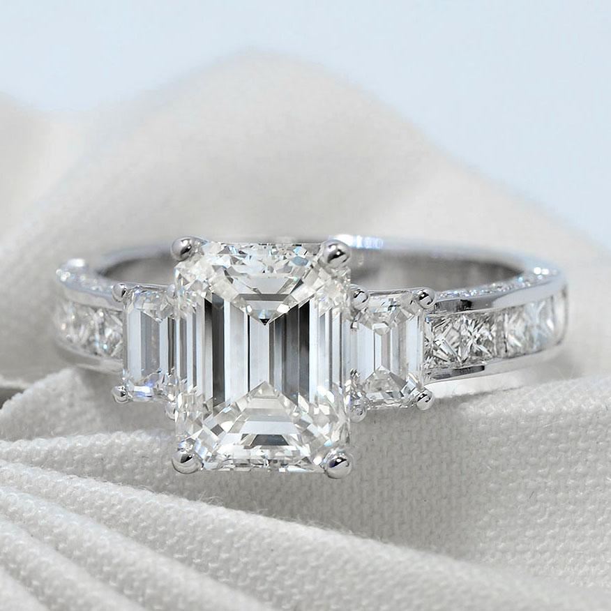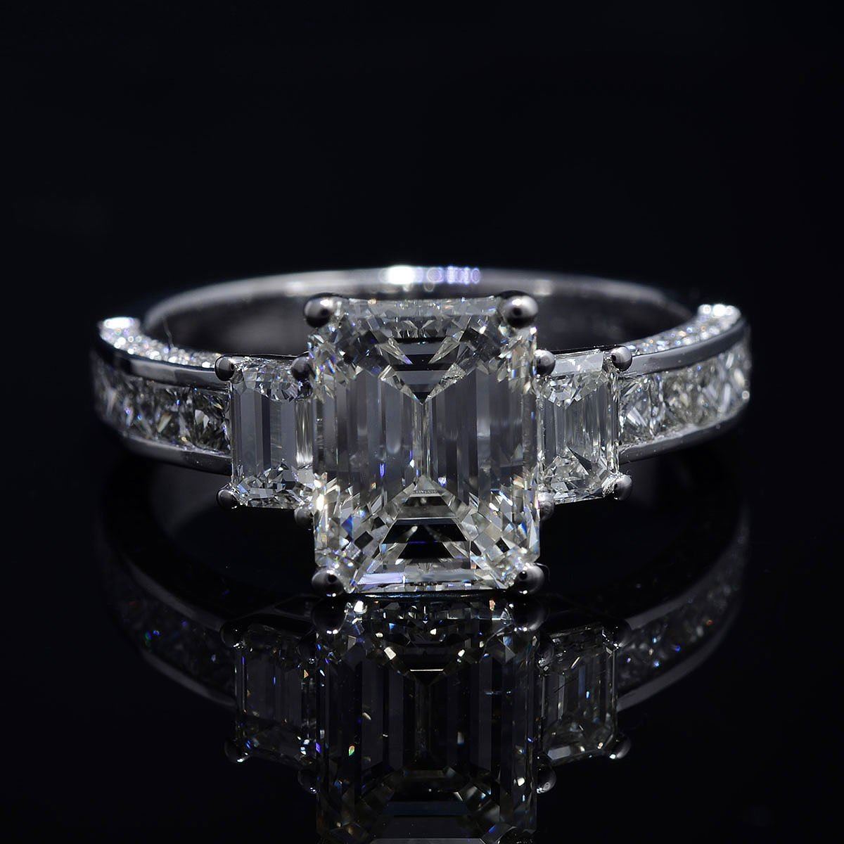 Natural 3.02 CTW Emerald Cut 3-Stone Diamond Ring 14KT White Gold