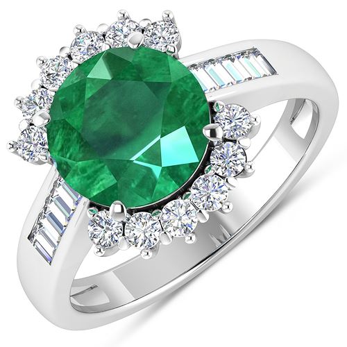 Zambian Emerald Round/9.00mm - 1/2.60 ctw Natural Heat Treated E + White Diamond Baguette/2.00x1.50mm - 8/0.22 ctw Prong Setting Natural Not Treated N