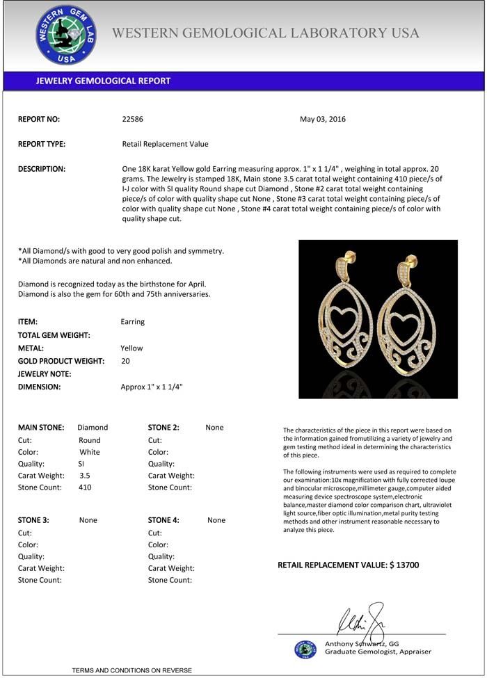 total approx. 20 grams. The Jewelry is stamped 18K, Main stone 3.5 carat total weight containing 410 piece/s of I-J color with