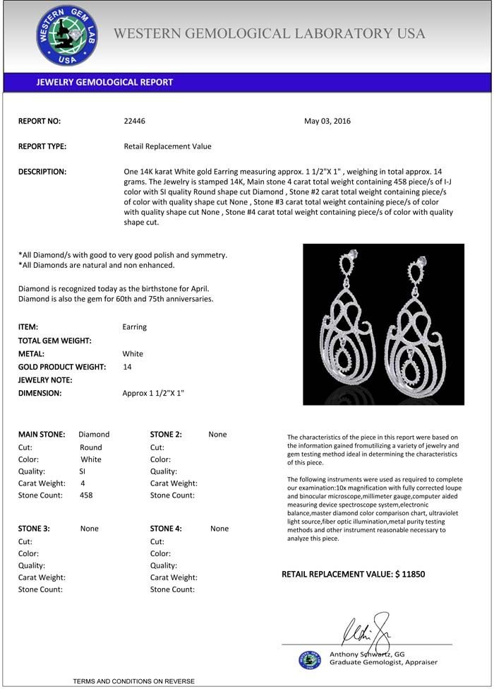 total approx. 14 grams. The Jewelry is stamped 14K, Main stone 4 carat total weight containing 458 piece/s of I-J color with
