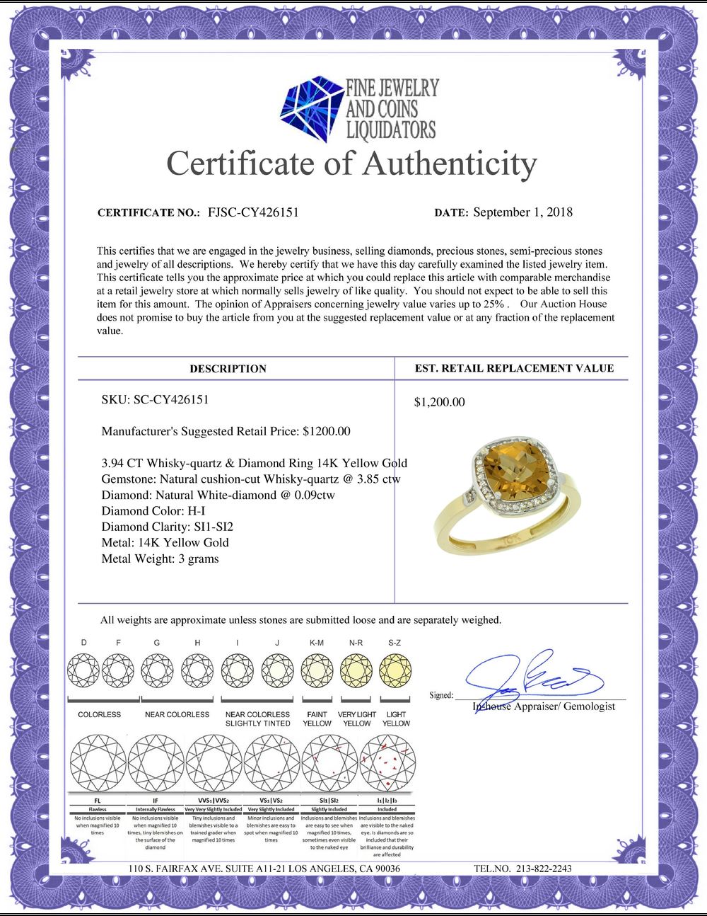 REF-36F7N ---- SKU:SC-CY426151 ---- Manufacturer's Suggested Retail Price - $1200.00 ---- Natural 3.94 ctw Whisky-quartz & Diamond Engagement Ring 14K Yellow Gold