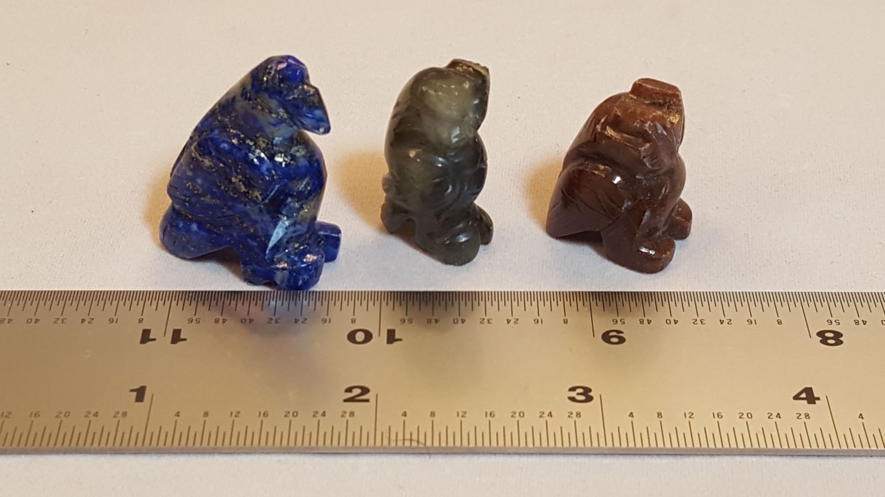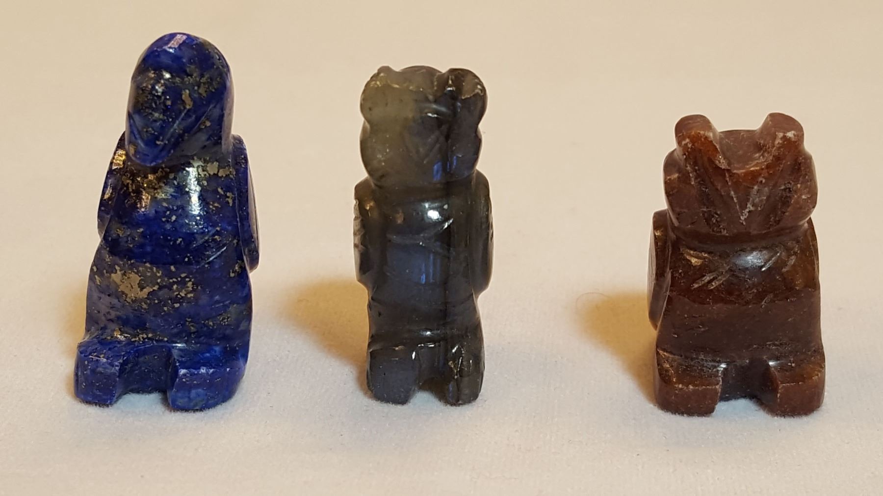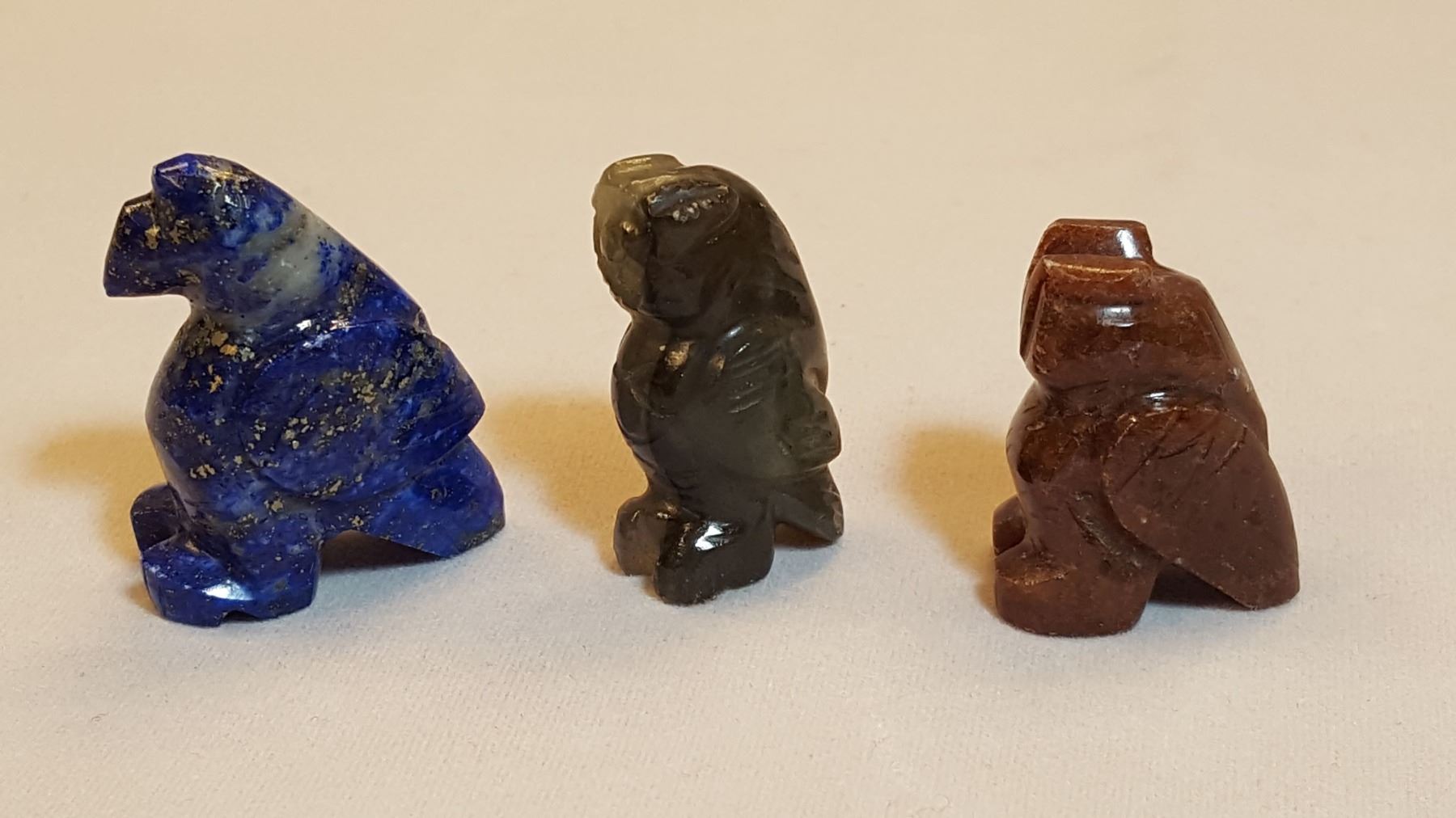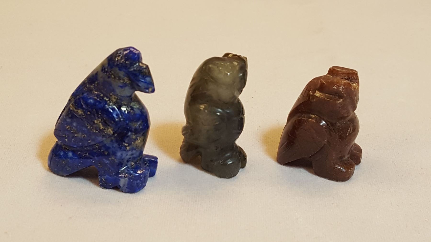 All natural gemstone 3 piece hand carved animal figurine set. Includes an a blue lapis lazuli falcon, a jade falcon and a jasper owl. Total weight is 26.8 grams.