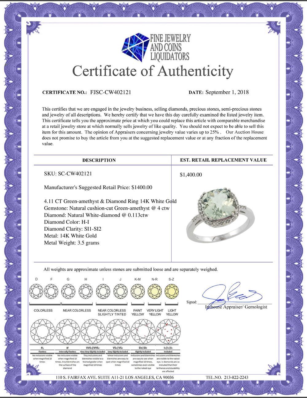 REF-44M2H ---- SKU:SC-CW402121 ---- Manufacturer's Suggested Retail Price - $1400.00 ---- Natural 4.11 ctw Green-amethyst & Diamond Engagement Ring 14K White Gold