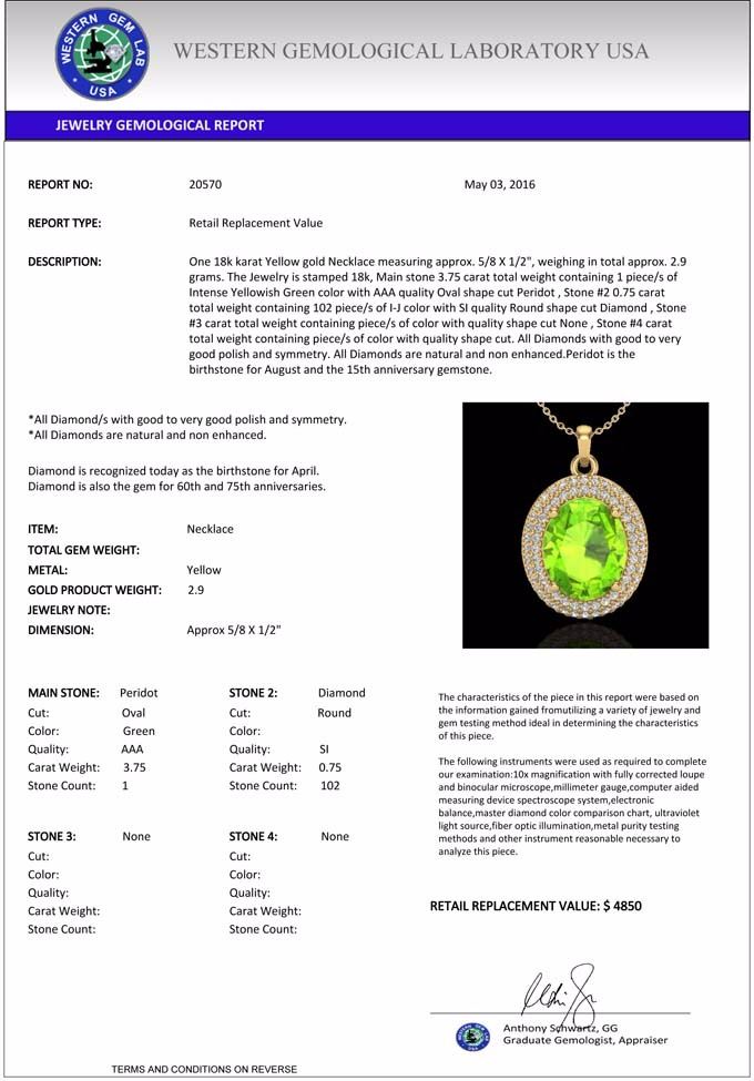 total approx. 2.9 grams. The Jewelry is stamped 18k, Main stone 3.75 carat total weight containing 1 piece/s of Intense Yellowish Green color with