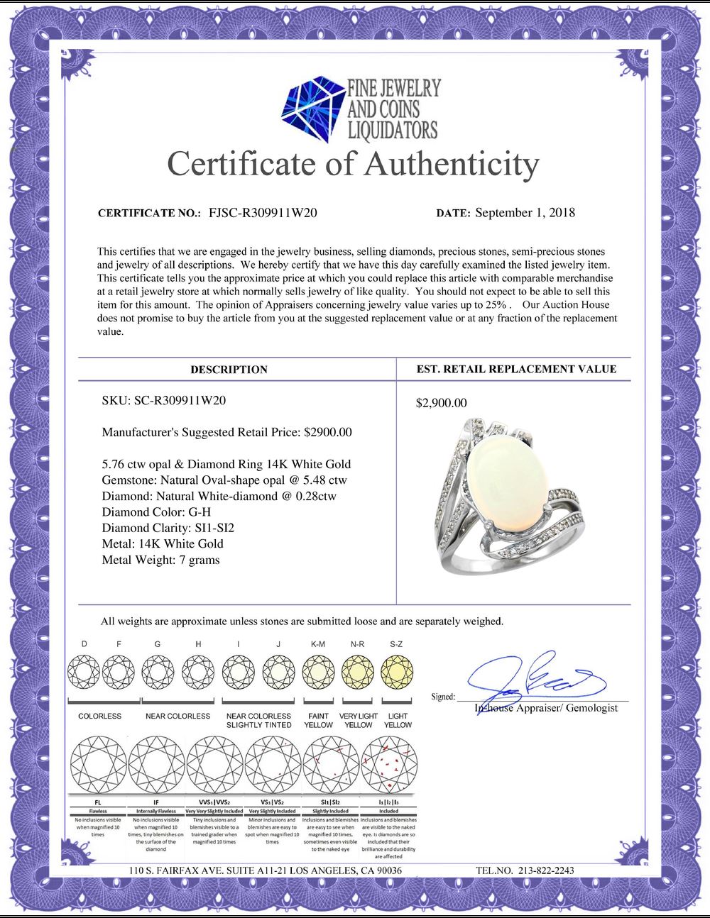 REF-94G6M ---- SKU:SC-R309911W20 ---- Manufacturer's Suggested Retail Price - $2900.00 ---- Natural 5.76 ctw opal & Diamond Engagement Ring 14K White Gold