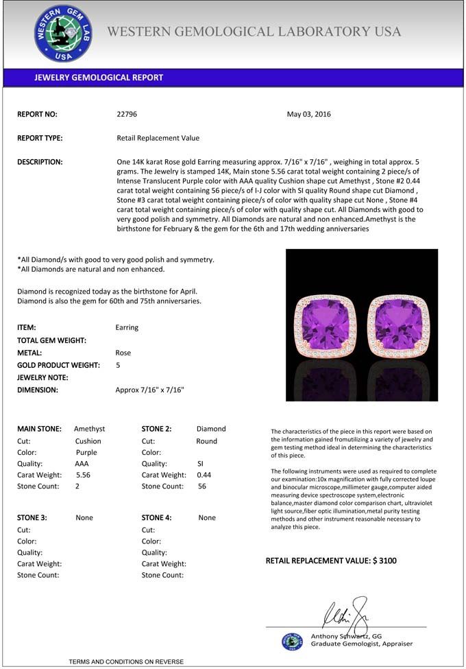 total approx. 5 grams. The Jewelry is stamped 14K, Main stone 5.56 carat total weight containing 2 piece/s of Intense Translucent Purple color with