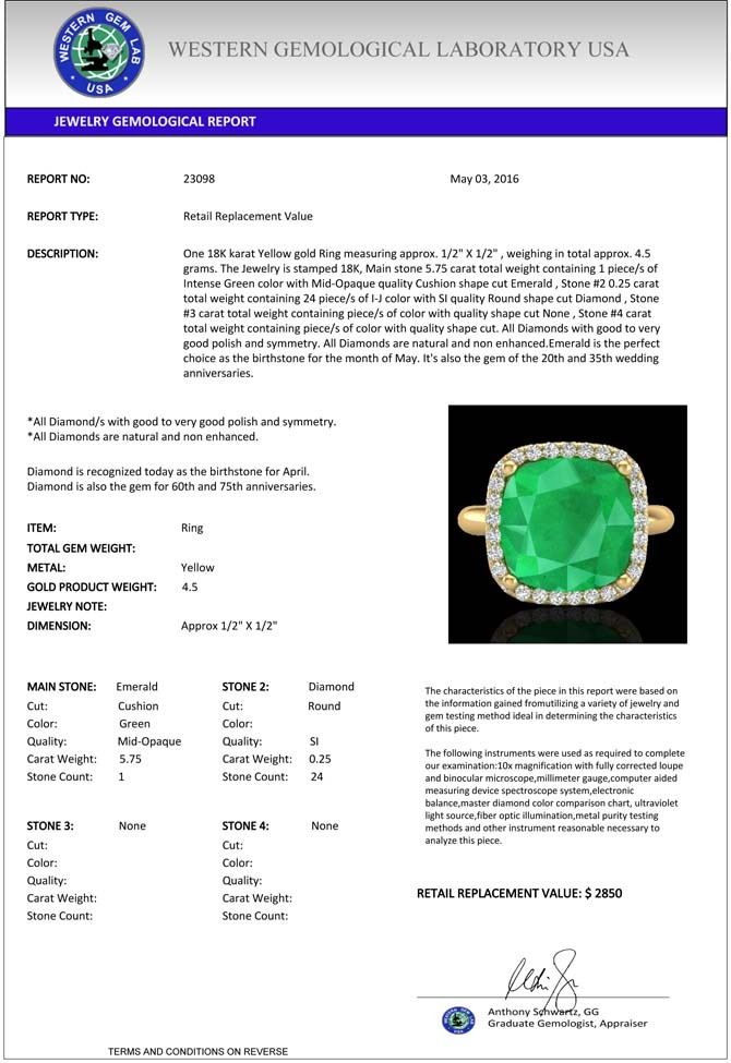 total approx. 4.5 grams. The Jewelry is stamped 18K, Main stone 5.75 carat total weight containing 1 piece/s of Intense Green color with
