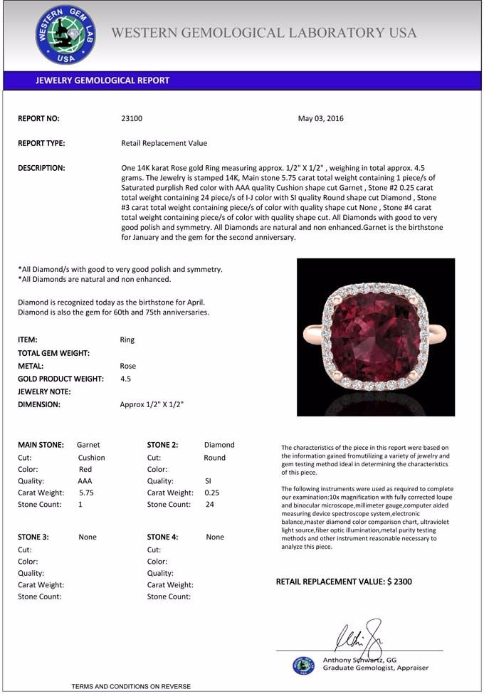 total approx. 4.5 grams. The Jewelry is stamped 14K, Main stone 5.75 carat total weight containing 1 piece/s of Saturated purplish Red color with