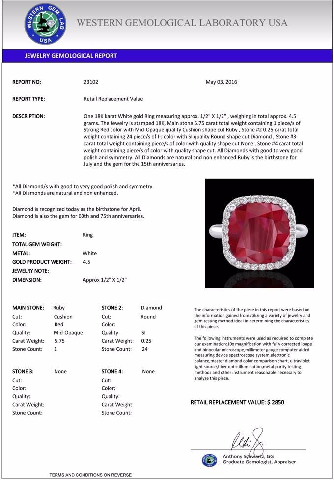 total approx. 4.5 grams. The Jewelry is stamped 18K, Main stone 5.75 carat total weight containing 1 piece/s of Strong Red color with