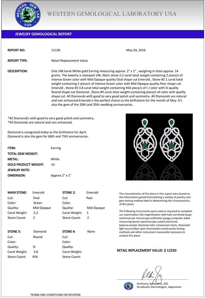 total approx. 14 grams. The Jewelry is stamped 14K, Main stone 2.2 carat total weight containing 2 piece/s of Intense Green color with