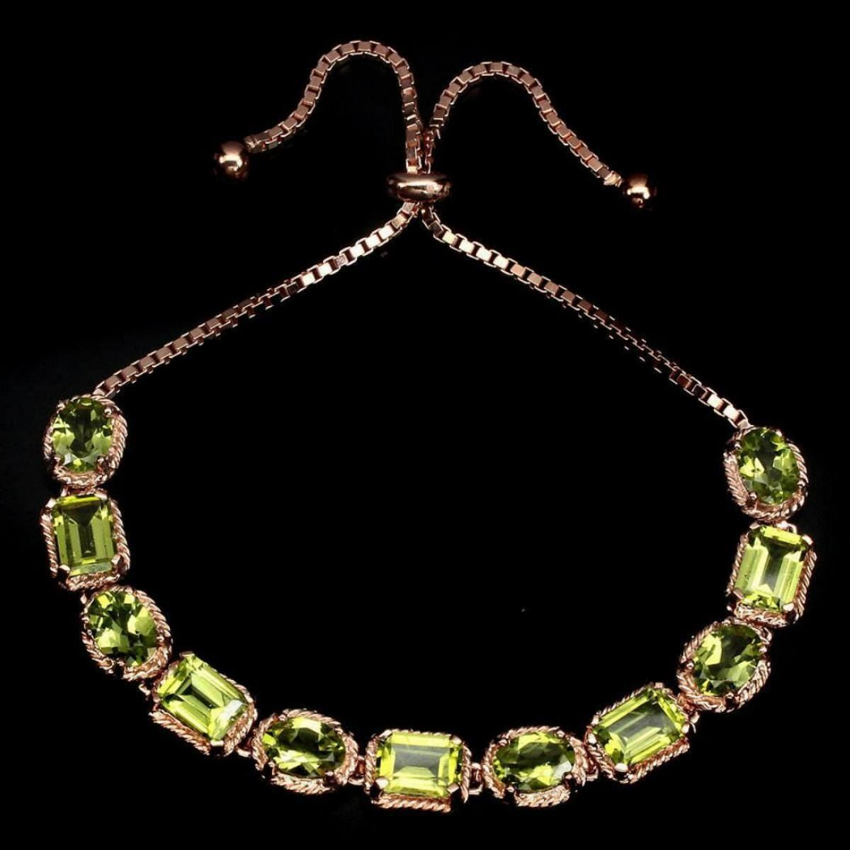 925 STERLING SILVER;PLATE14K ROSE GOLD;LENGTH (INCHES)10;MAIN STONEPERIDOT;TOTAL WEIGHT57.70 CT (TOTAL WEIGHT OF SILVER + STONE)DIMENSION* STONE 7.0 X 5.0 MM. * FACE BRACELET 105.0 X 8.0 MM.MAIN STONE SHAPEOCTAGON CUTMAIN STONE COLORTOP RICH GREENCLARITY/GRADEIF TO VVSLUSTERGORGEOUSTREATMENTUNHEATEDORIGINPAKISTANHARDNESS6.5 - 7.0