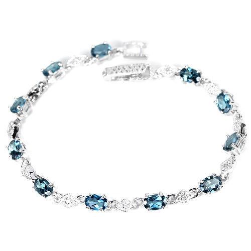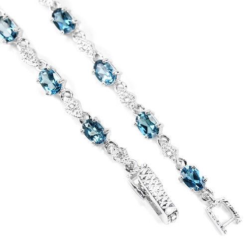 GENUINE LONDON BLUE TOPAZ WHITE CZ 925 SILVER BRACELET 14K WHITE GOLD CAOTING; LENGTH OF ITEM (Inch.) 7.50 ( RESIZE : NO ) ITEM QUANTITY 1 STONE SHAPE OVAL STONE DIMENSION 6 X 4 MM. ITEM WEIGHT 9.8 GRAM COLOR LONDON BLUE CLARITY IF TO VVS LUSTER ELEGANT TREATMENT IRRADIATION ORIGIN OF STONE AFRICA HARDNESS 8.0 WHITE CUBIC ZIRCONIA 1.3 MM.