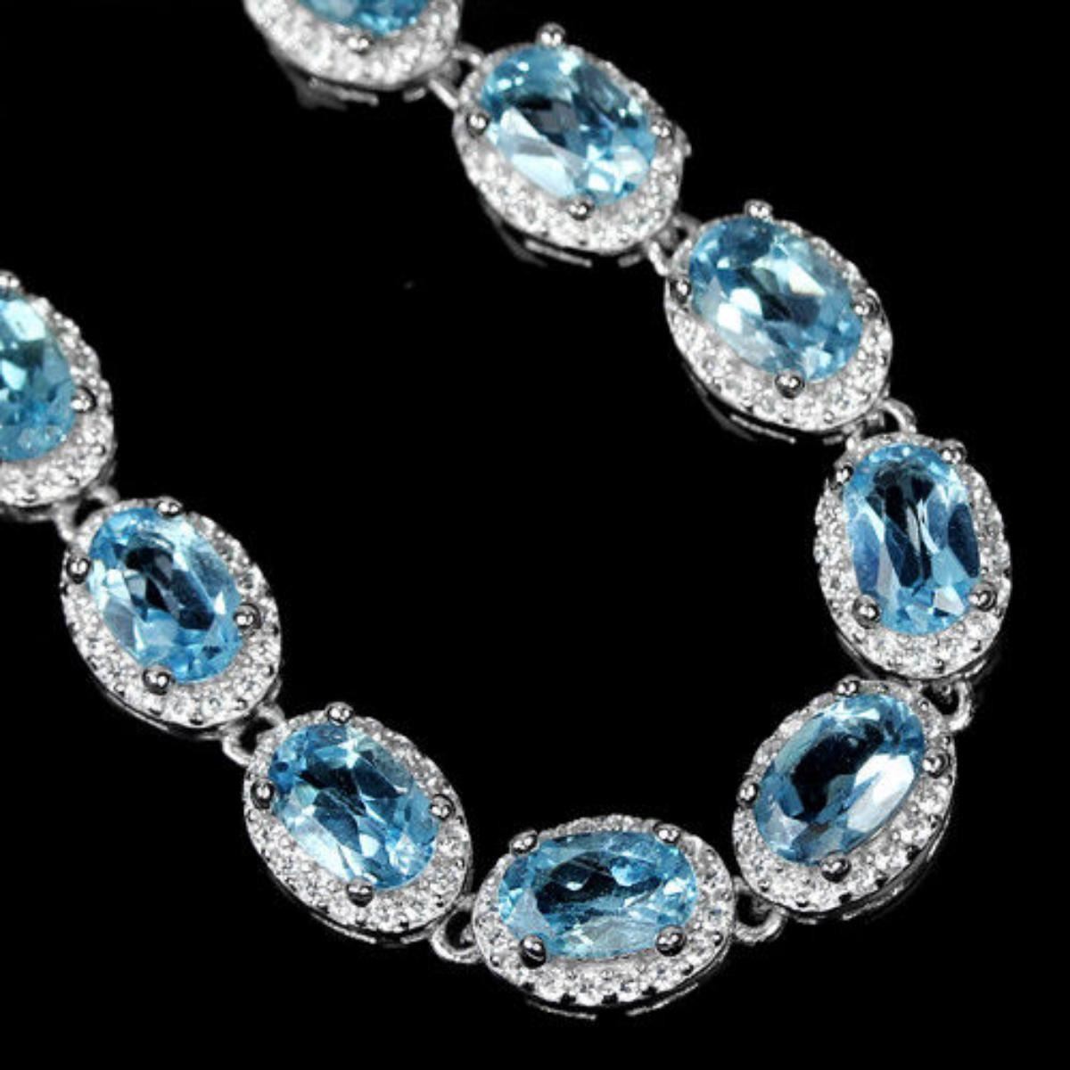 GENUINE SWISS BLUE TOPAZ & WHITE CZ 925 SILVER BRACELET 14K WHITE GOLD COATING; LENGTH OF ITEM (Inch.)7.75 ;ITEM QUANTITY1STONE SHAPEOVAL PORTUGUESE CUTSTONE DIMENSION6 X 4 MM.ITEM WEIGHT11.32 GRAMCOLORAAA SWISS BLUECLARITYIF - VVSLUSTERDAZZLINGTREATMENTIRRADIATIONORIGIN OF STONEAFRICAHARDNESS8.0;WHITE CUBIC ZIRCONIA 1 MM.