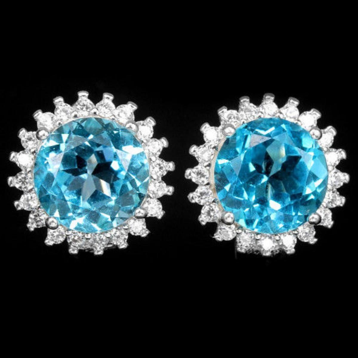GENUINE SWISS BLUE TOPAZ & WHITE CZ 925 SILVER EARRING 14K WHITE GOLD COATING; STONE SHAPEROUNDSTONE DIMENSION8 MM.ITEM WEIGHT4.6 GRAMCOLORSWISS BLUECLARITYIF - VVSLUSTERALLURINGTREATMENTIRRADIATIONORIGIN OF STONEAFRICAHARDNESS8.0FACE OF EARRING 12 X 12 MM. WHITE CUBIC ZIRCONIA 1.2 MM.