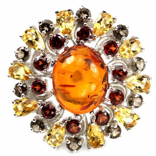 REAL AMBER GARNET CITRINE SMOKY QUARTZ 925 SILVER RING 14K WHITE GOLD COATING; RING SIZE- 5.75 (can be resized) ITEM QUANTITY 1 STONE SHAPE MIXED SHAPE STONE DIMENSION 12 X 10 MM. , 5 X 3 MM. 2.5 MM. ITEM WEIGHT -7.64 GRAM; COLOR -MULTI COLOR; CLARITY -TRANSLUCENT IF,VVS; LUSTER -DAZZLING; TREATMENT -UNHEATED; ORIGIN OF STONE -POLAND; HARDNESS -2.0 - 7.0; FACE OF RING -26 X 26 MM.