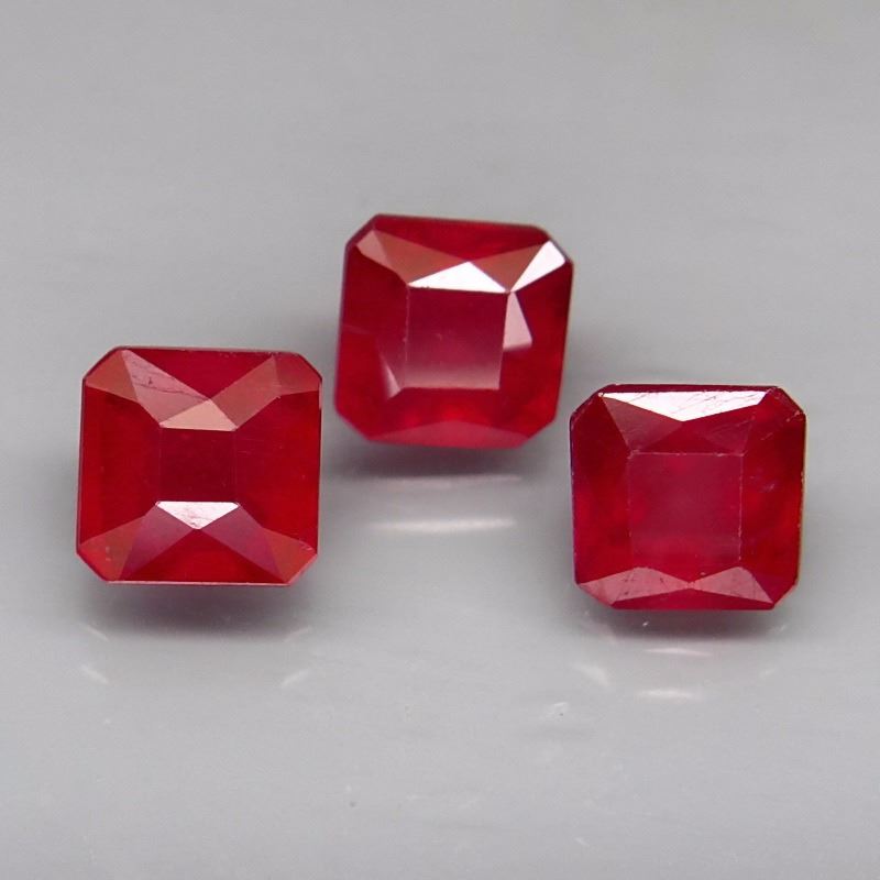 GEM TYPE :Ruby;WEIGHT :4.76 Ct.;SIZE :6 X 6 Mm.;QUANTITY :3 Pieces;COLOR :Top Red;CLARITY :Transparent;LUSTER :Superior;ORIGIN :Mozambique, Africa;TREATMENT :Heated;HARDNESS :9