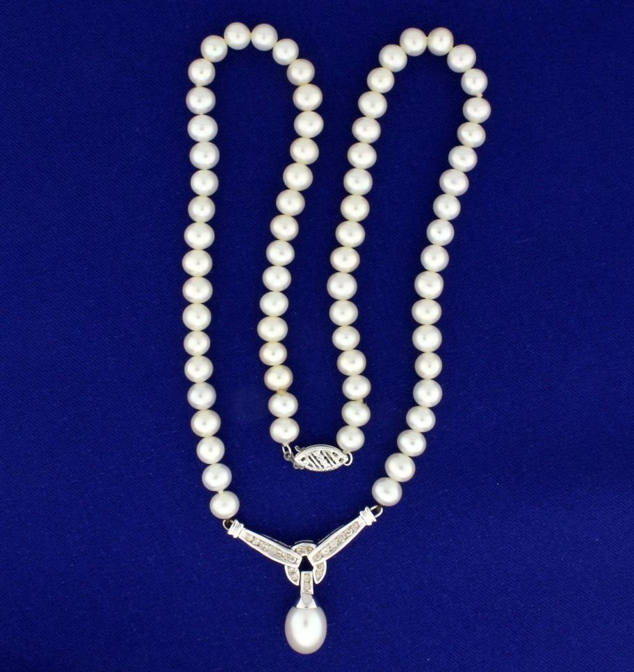 In 14k white gold. Contains seventy two 6mm high quality natural Akoya pearls with excellent color and luster. Also contains one 12mm tear drop shaped Akoya pearl and 1/2ct TW of high quality round diamonds of SI clarity/I color. 18" long.