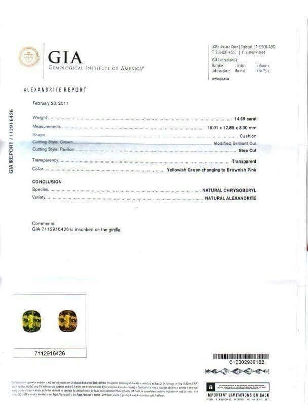 Natural Alexandrite 14.69 carats - GIA certified; completely natural and no treatment in any way; Please refer to GIA certificate for specifications. Origin - Russia