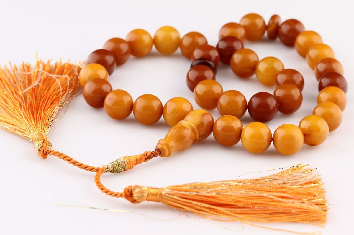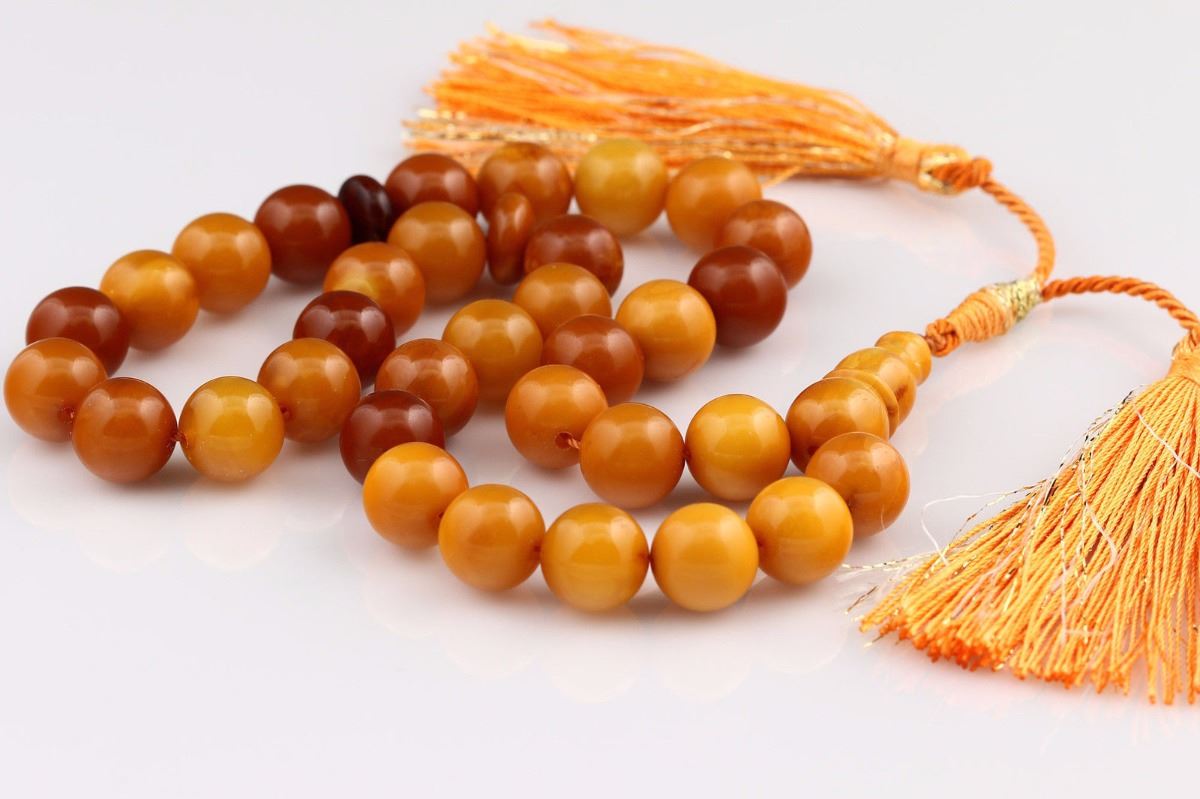 Natural Amber Islamic Prayer 33 Beads Tasbih.....Description: Excellent vintage style genuine Baltic amber Islamic 33 prayer made of round shape beads.Size: It weighs 31.7 grams. Diameter of round beads is 11mm. Length ~ 16.1" (41cm).
